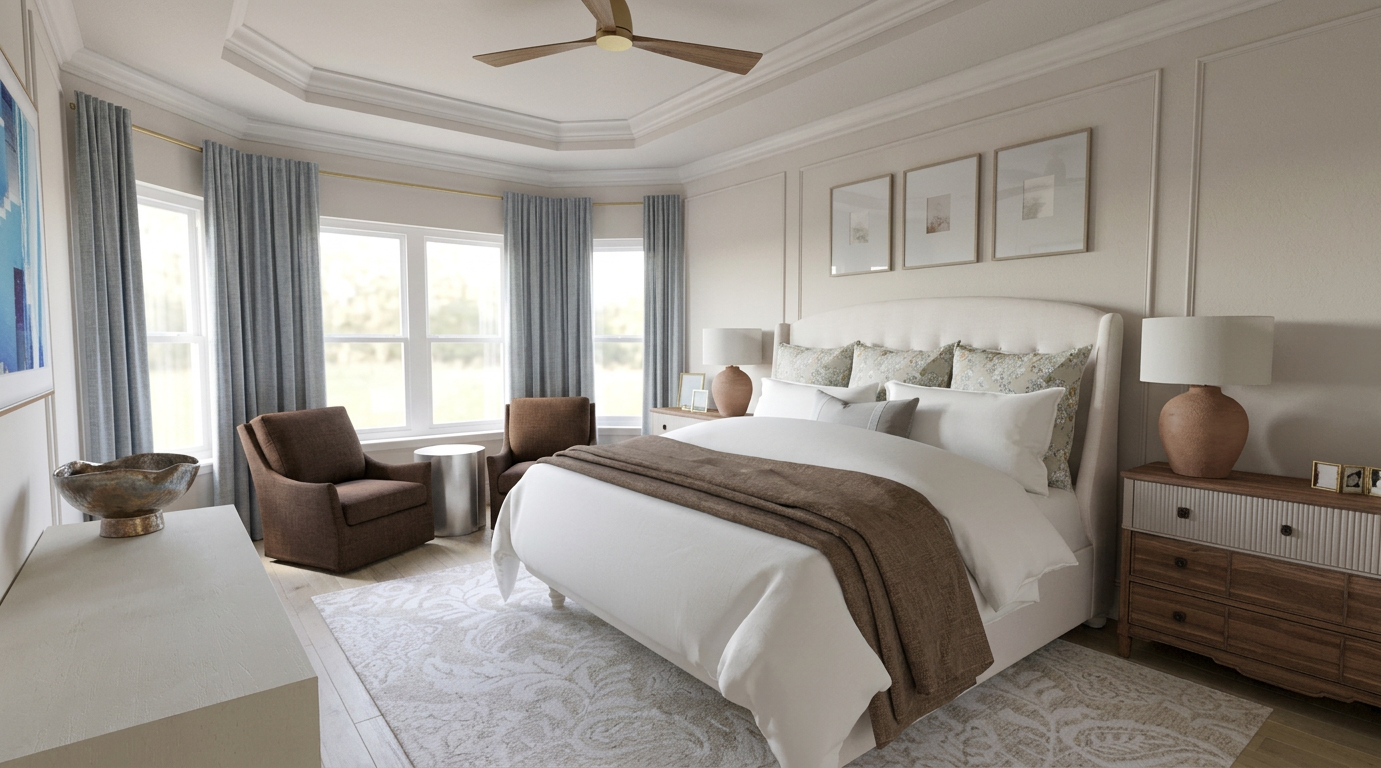 make the table in between the chairs an antiqued mirror finish make the lamps a grey pottery finish make the blades of the fan a white wood make the bowl on the dresser a stone finish change nothing else