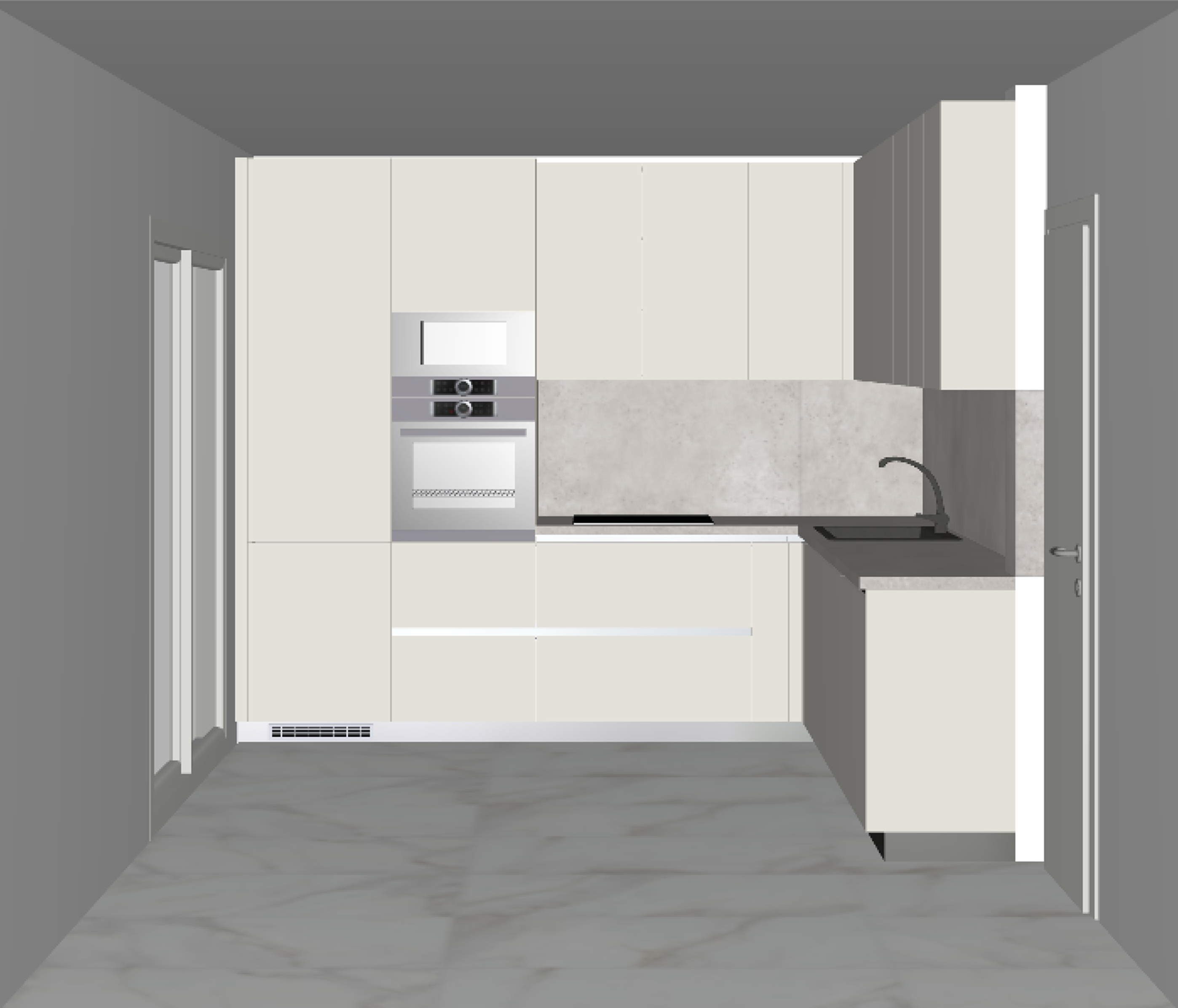 modern minimalist kitchen sleek ivory cabinets matte gray countertops stainless steel appliances light gray marble floor subtle concrete backsplash soft ambient lighting warm and inviting atmosphere