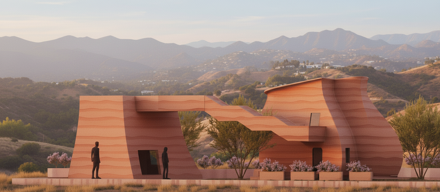 highly realistic architectural visualization of a contemporary rammed earth home in a desert mountain landscape at golden hour maintain the same sculpted curving massing gradient sedimentary rammed earth banding and warm terracotta tones enhance material realism with visible fine textures subtle soil stratification lines and natural surface roughness improve lighting accuracy with soft directional sunlight bounced warm tones and atmospheric depth in the background mountains add natural shadows light occlusion and realistic contact points between the structure and ground keep vegetation true to an arid climate muted greens soft shrubs desert grasses use cinematic color grading high dynamic range photorealistic rendering quality crisp details and physically accurate materials no stylization no exaggerated colors just hyper real yet natural realism