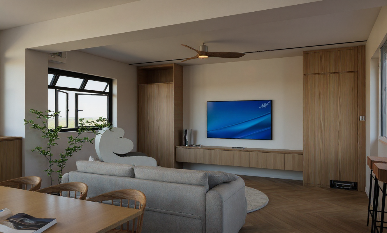 render this section drawing in a soft architectural watercolor style while strictly preserving all geometry and interior layouts exactly as shown do not modify the location or proportions of rooms windows doors stairs corridors furniture or structural elements maintain exact level alignment and section cut thickness add soft architectural shadows to give depth keep shadows subtle consistent with a daylight source coming from the upper left apply shadows only to masses recesses balconies overhangs interior walls behind the cut plane and site elements do not distort geometry to create shadows use gentle watercolor washes on walls and floors keeping the linework crisp at the cut plane match the style and color palette of the previous elevations muted grays soft beige tones and light greens in background massing avoid altering or simplifying any interior components