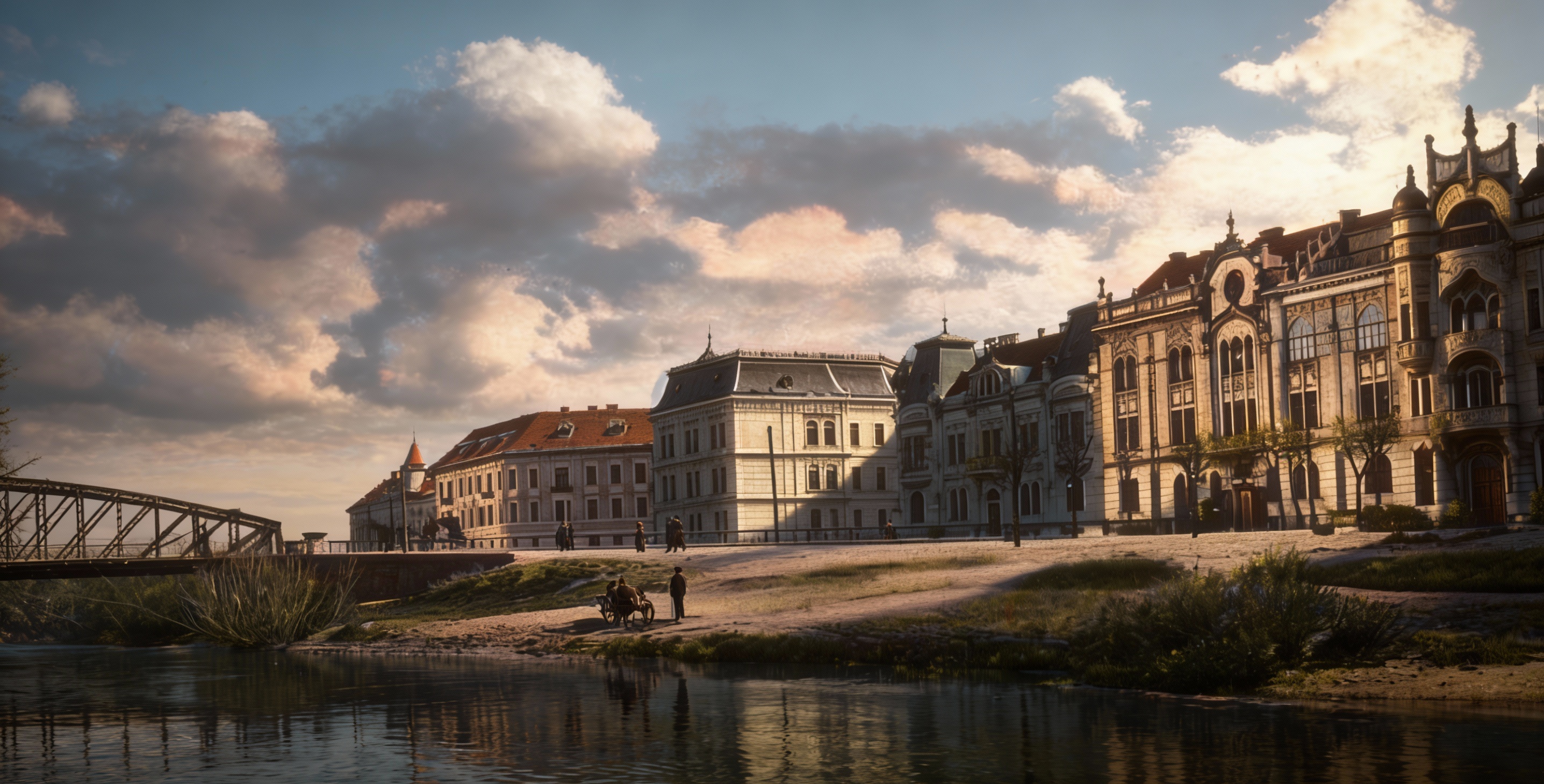 remove text from top of the picture beautyful clouds cinematic view 1900 s atmosphere black with white coloured trams more lenlighted hyperlight in the shadows