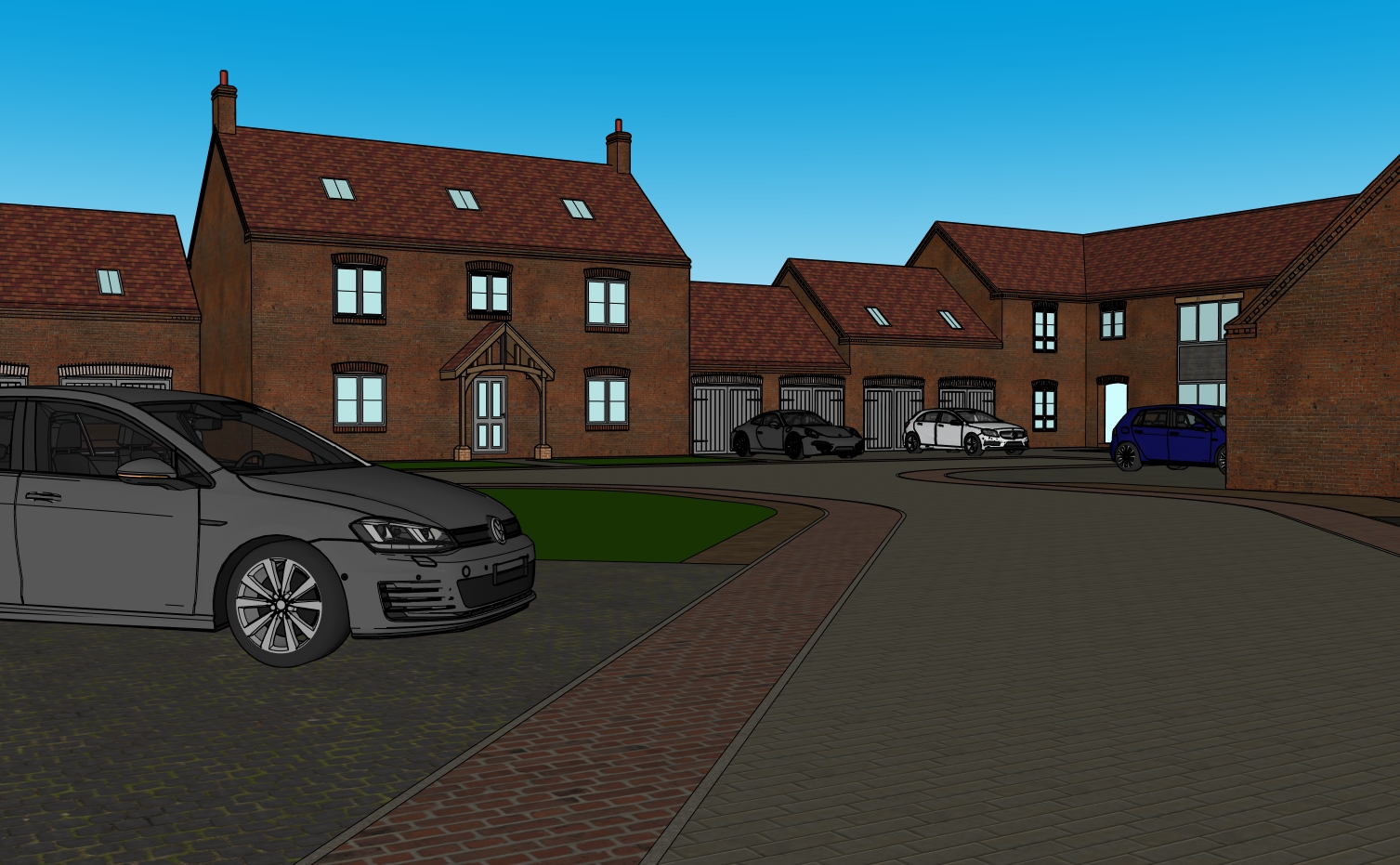 create an artist imperssion with light cloudy sky summer golden hour light grey windows and doors red roof pan tiles red brickwork add landscaping