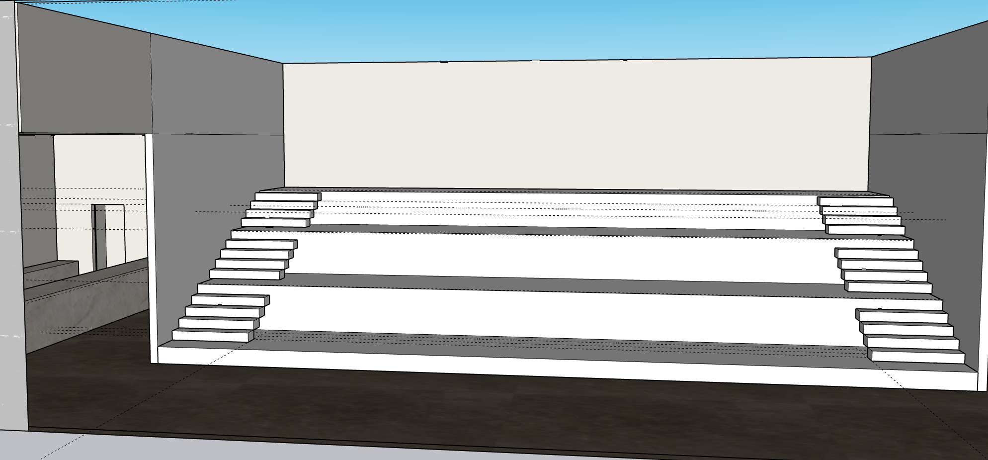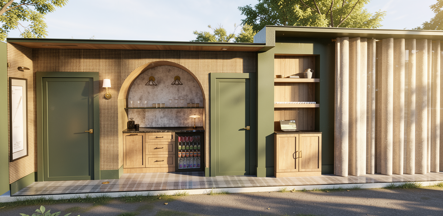 add red velvet theatre seating with small side tables and lamps in between them on the ampitheatre seating add a bar in the left hand side behind the wall add people and a ceiling with a chandelier in the middle and a draped fabric ceiling