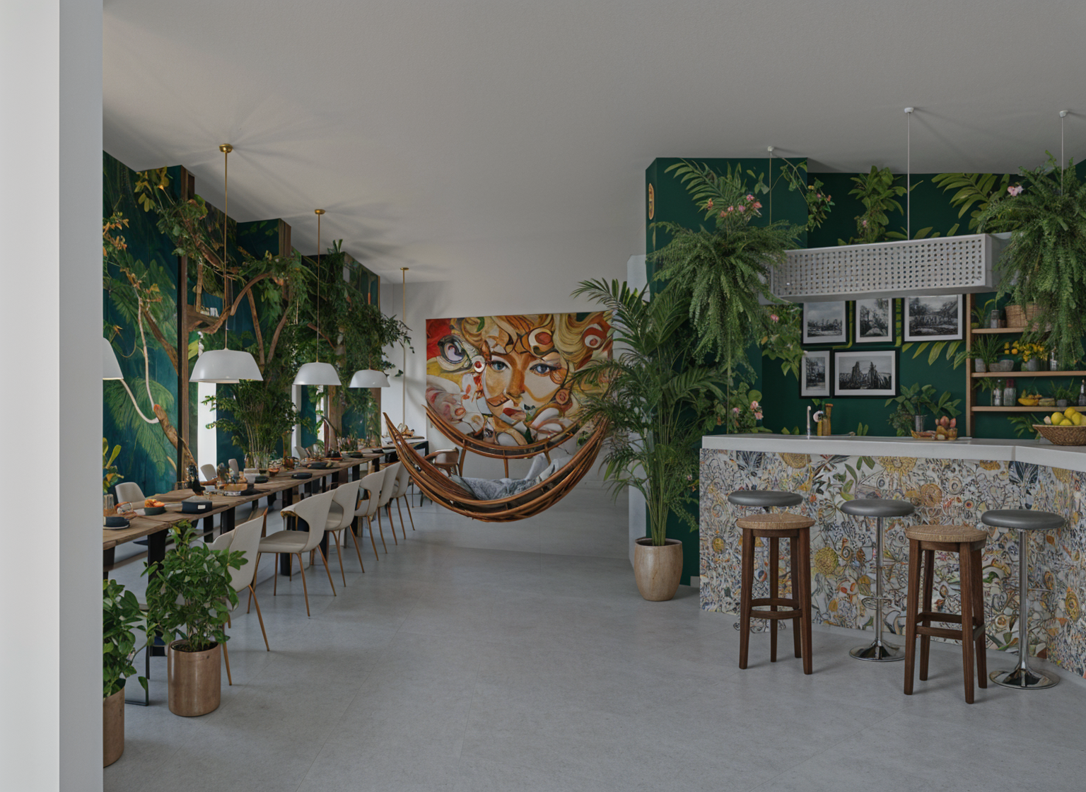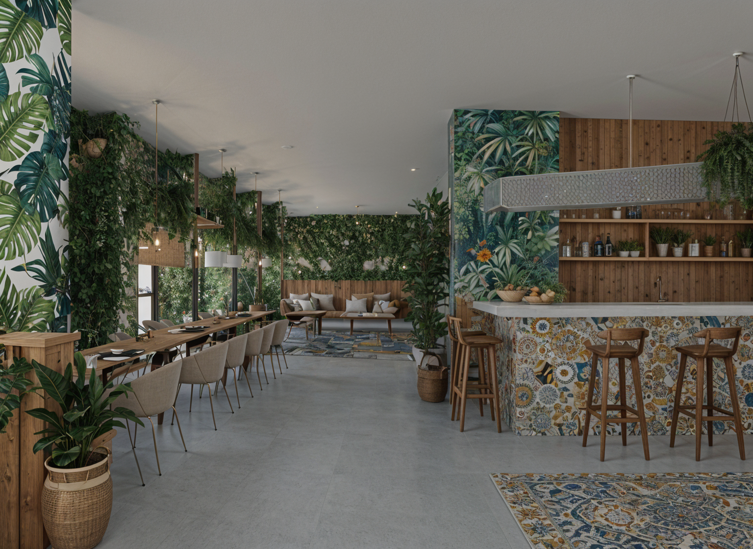 brazilian style restaurant with a lot of plands and wallpapers polished concrete floor and tiles on the bar very tropical look and feeling wooden furniture set with cutlery and crockery bottles glassens and light behind the bar please keep the geometry and the floorplan dramatic light under the bar counter