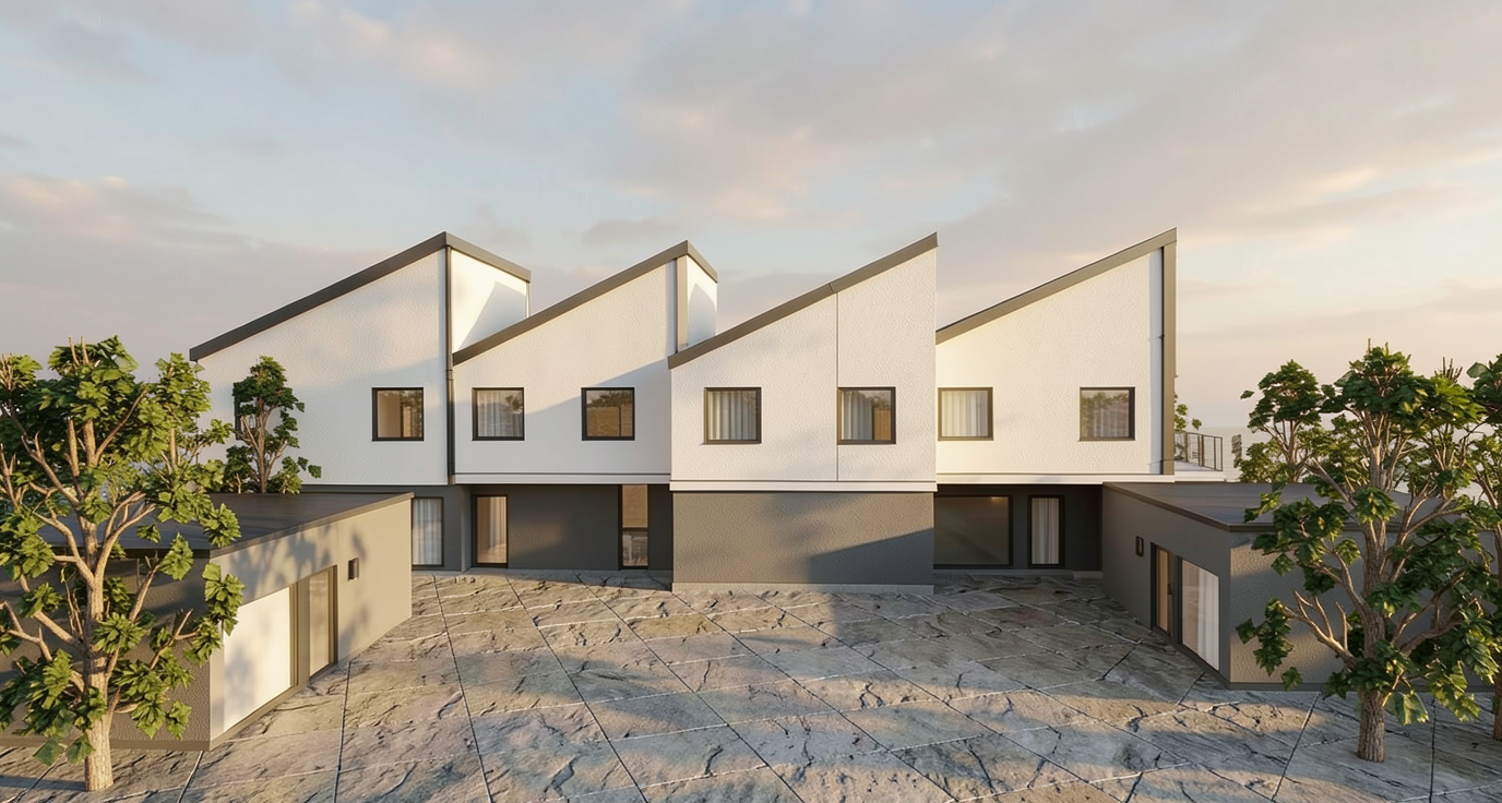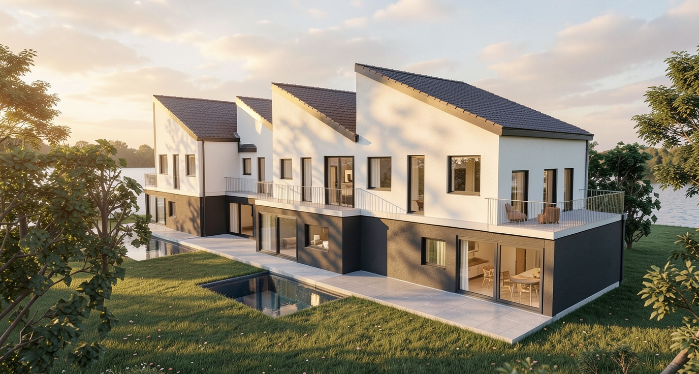 generate a serene architectural render featuring two curved buildings with timber cladding and large glass windows both buildings will have a roof terrace surround them moved lawn and strategically placed clusters of trees incorporate a tranquil pond in the foreground to the left of the image with its blue water reflecting the sky and paddleboarders on the pond add pathways with vibrant flowerbeds create a warm golden sunset glow to enhance the peaceful atmosphere casting soft shadows across the scene