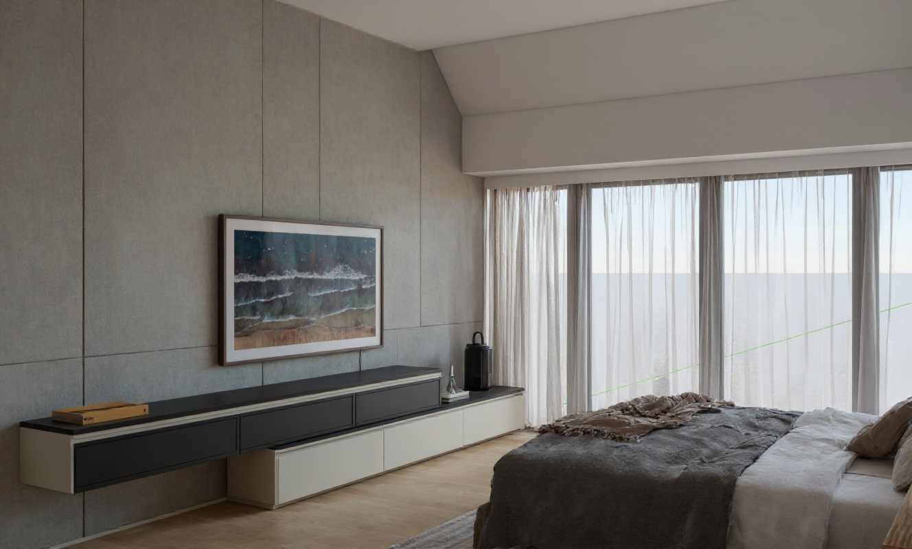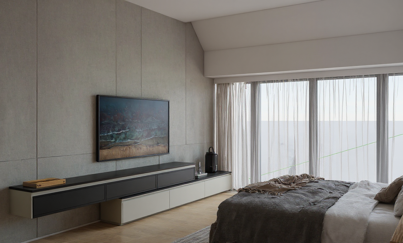 very light cream smooth wall panel texture behind tv black marble top tv console