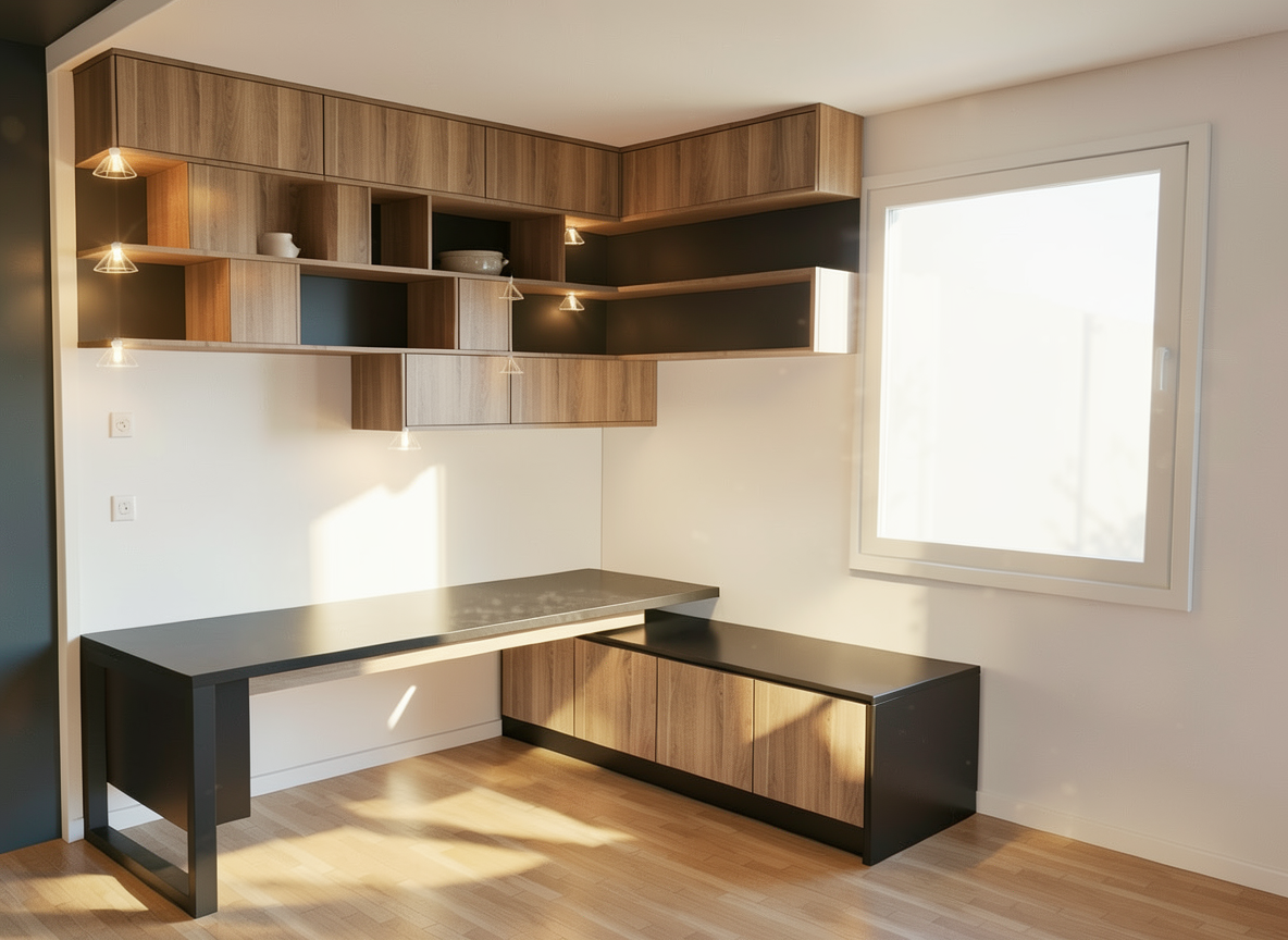render this dark oak hardwood floor blue speckle countertops and a dog bowls on counter no sunlight stainless steel fridge