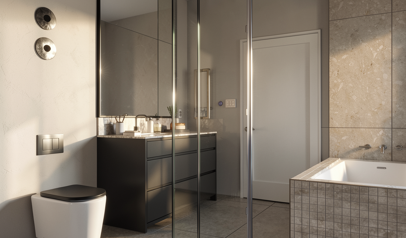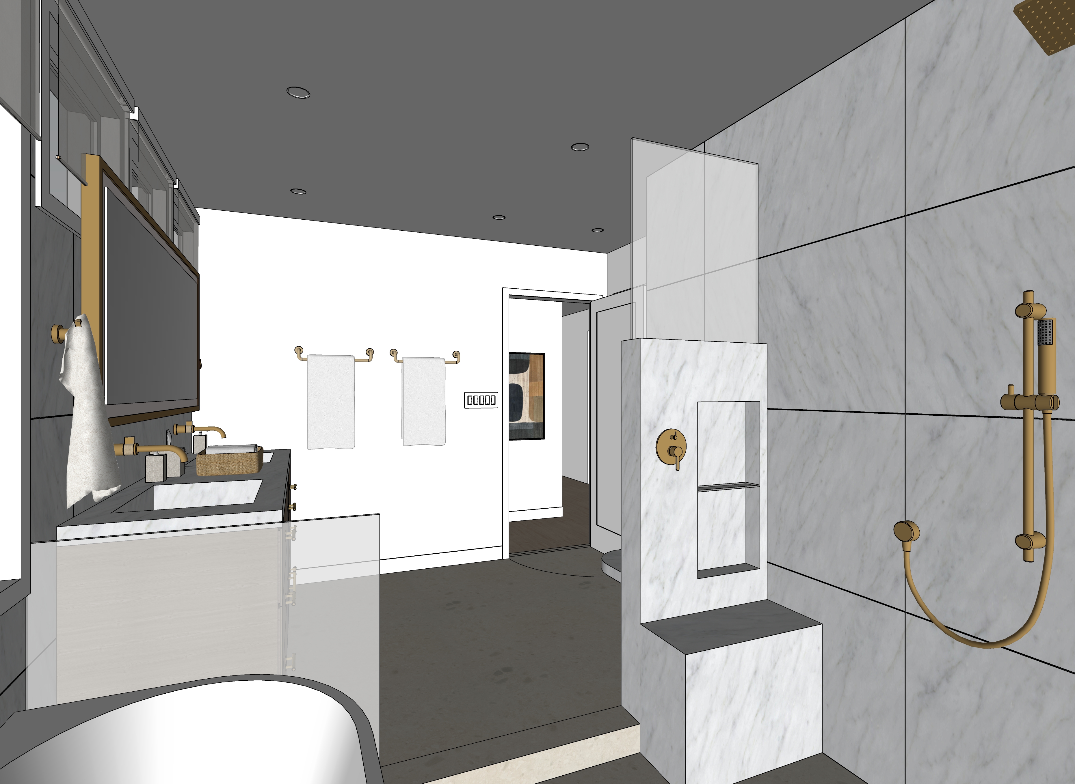 make the lighting evening time add led light on the niches shower and the tub add led lighting around the bathroom mirror add bathroom accessories and towels to the view add light coming from the recessed lights on the ceiling the floor is an ivory colored porcelain tile