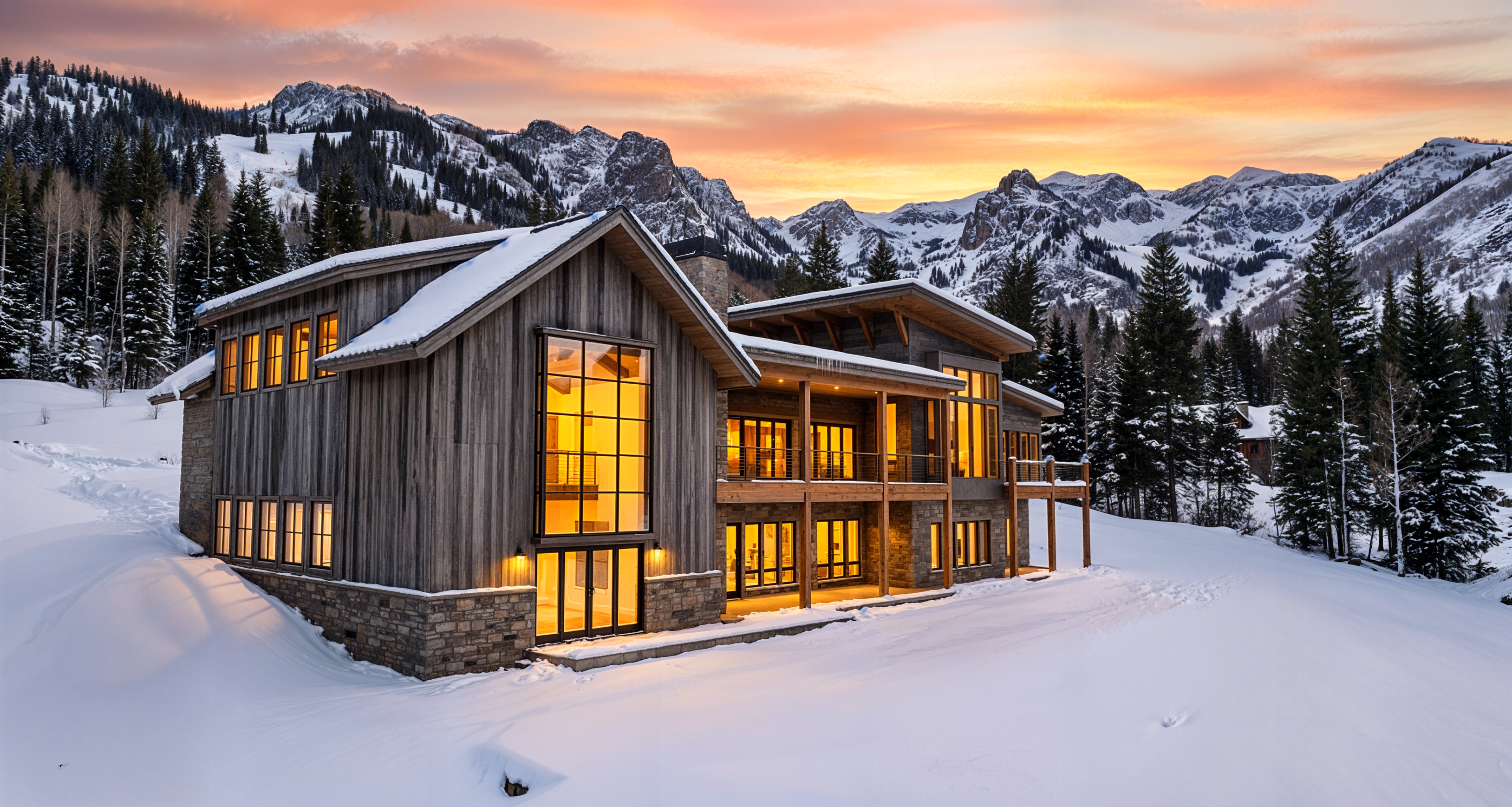replace siding between the windows at the left side of the image with gray panels mimicking the windows and add mugo pines in the foreground slightly to the right