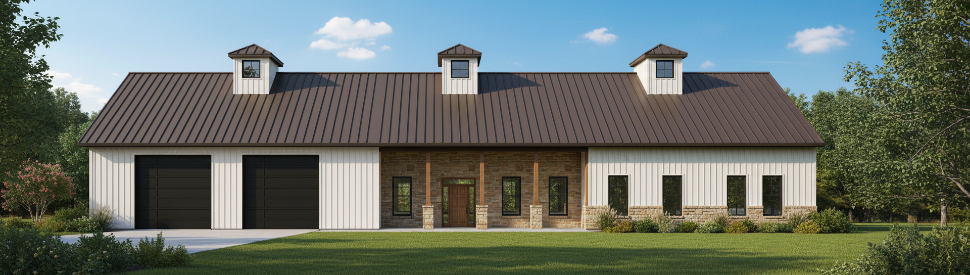 its a house with grey vertical batten siding it has grey stone for the foundation wall and deck wall it has a black metal roof the house sits on a grass lot add light fixtures to the porch wall add deck chairs to the deck add a pool in the yard