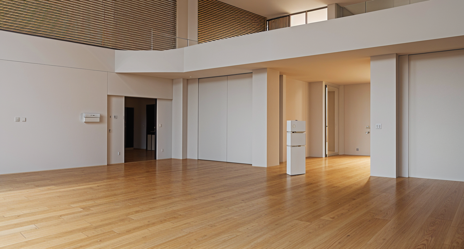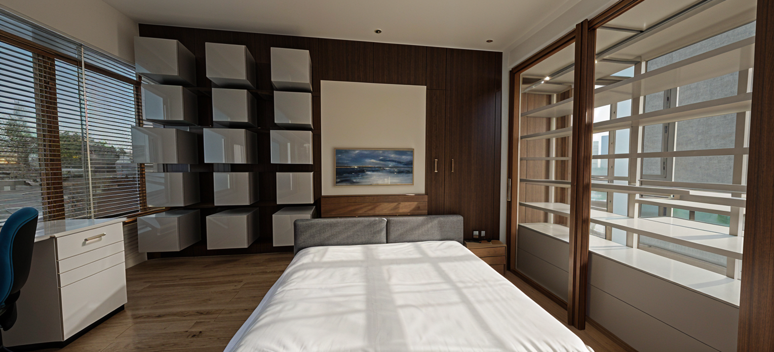 render this elevation and fill in the side walls add wide plank flooring in white oak and make the bed frame white oak