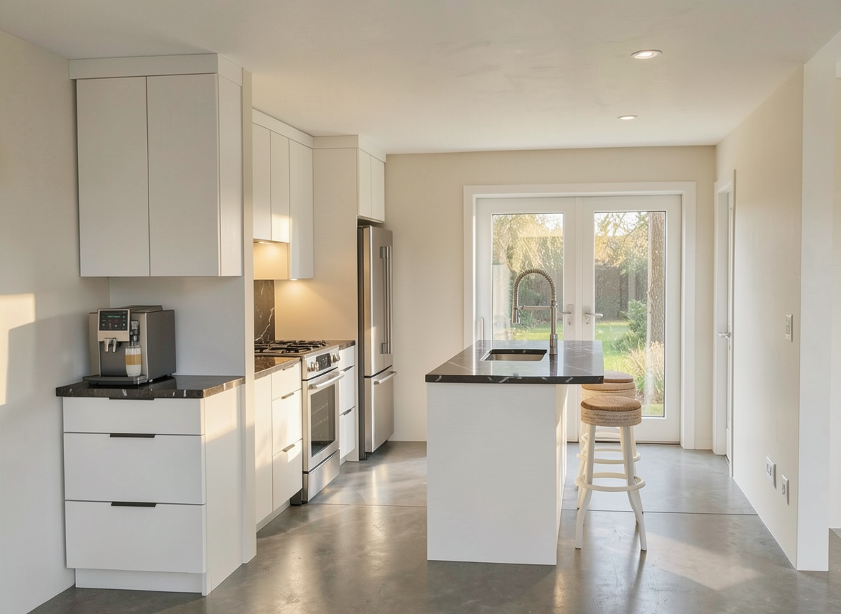 create a 3d rendering of this modern cottage use light gray horizontal lap siding with black windows and doors use timber post and beam for the porch structure and use a glass railing for the second floor deck no railing on 1st floor it should have a forested landcape with a lake in the background