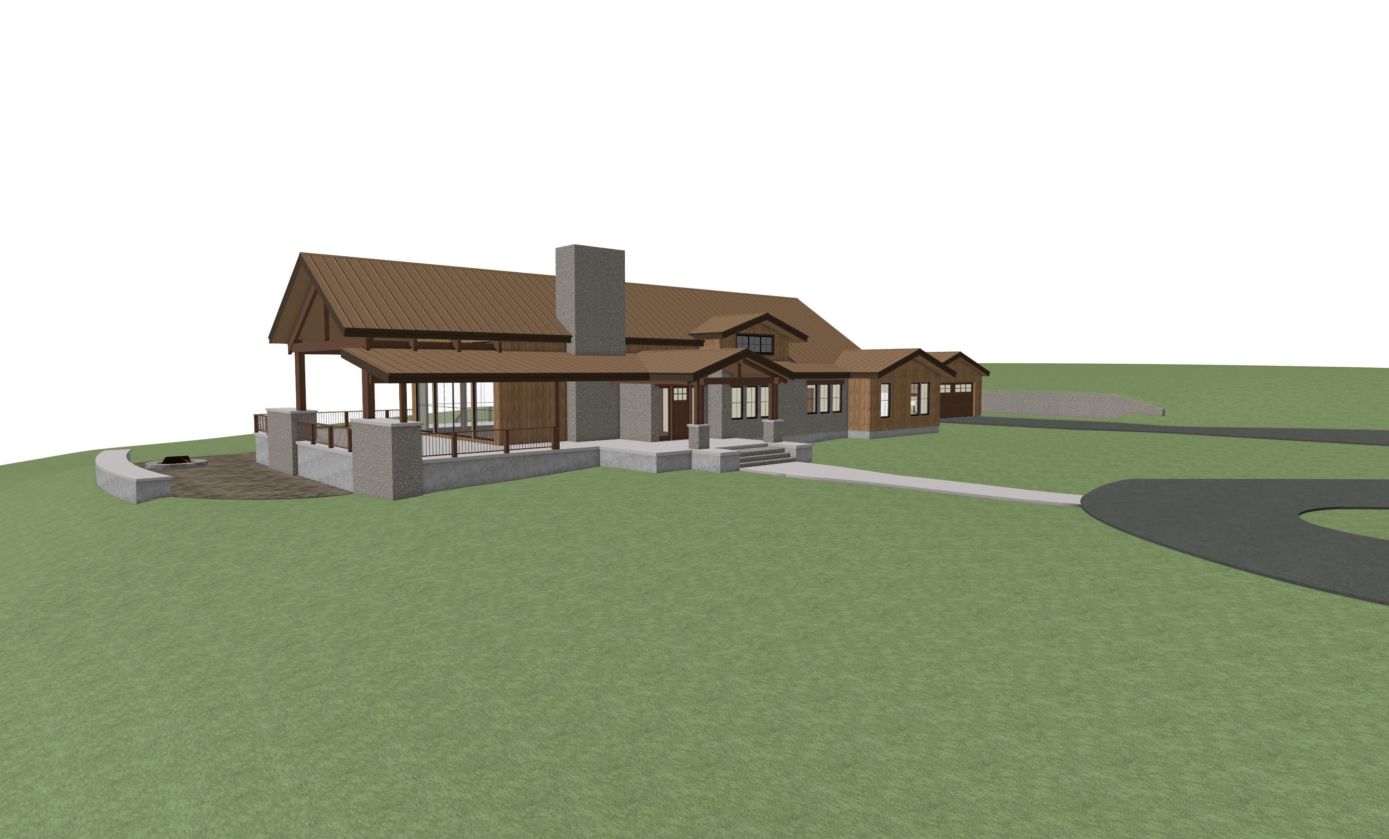 this in montana use native montana trees and vegetation make wood siding ghost wood like jackson hole but leave the rock siding dont change the rock siding just make it more realistic keep the rock on the front entry and to the right of the house make golden hour outside show golden light coming from inside make roof copper standing seam roof make concrete on foundation rock material do not change the shape of the structur or window sizes there is only the center there is rock slab patio on left side of porch keep rock on walls and chimney