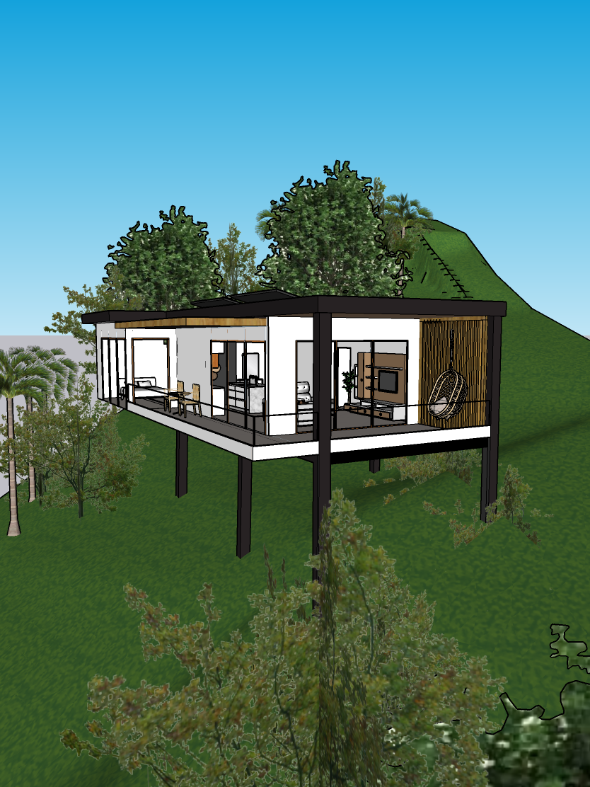 exterior shot a modern coastal hillside house with a glass facade overlooking the ocean on the horizon nestled in a lush green cliff the structure is supported by black metal beams and features a spacious terrace surround the house with vibrant greenery in varying shades of green including tall trees and dense foliage the sky is a clear bright blue evoking a peaceful sunny atmosphere create a serene and natural environment with realistic textures and lighting
