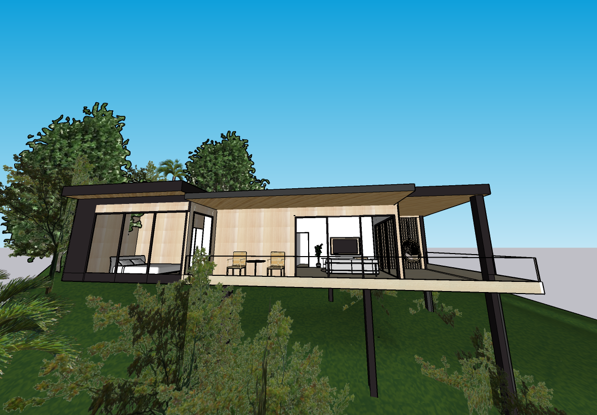 exterior shot render a modern wooden hillside home with a minimalist design the exterior is a light very pale natural wood sidings complemented by sleek black trim the open deck features comfortable seating in neutral tones lush green trees surround the house providing a serene atmosphere the sky is a clear vibrant blue casting a warm inviting light over the scene emphasize a peaceful luxurious ambiance with a hint of modern elegance