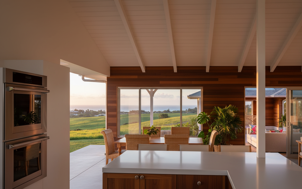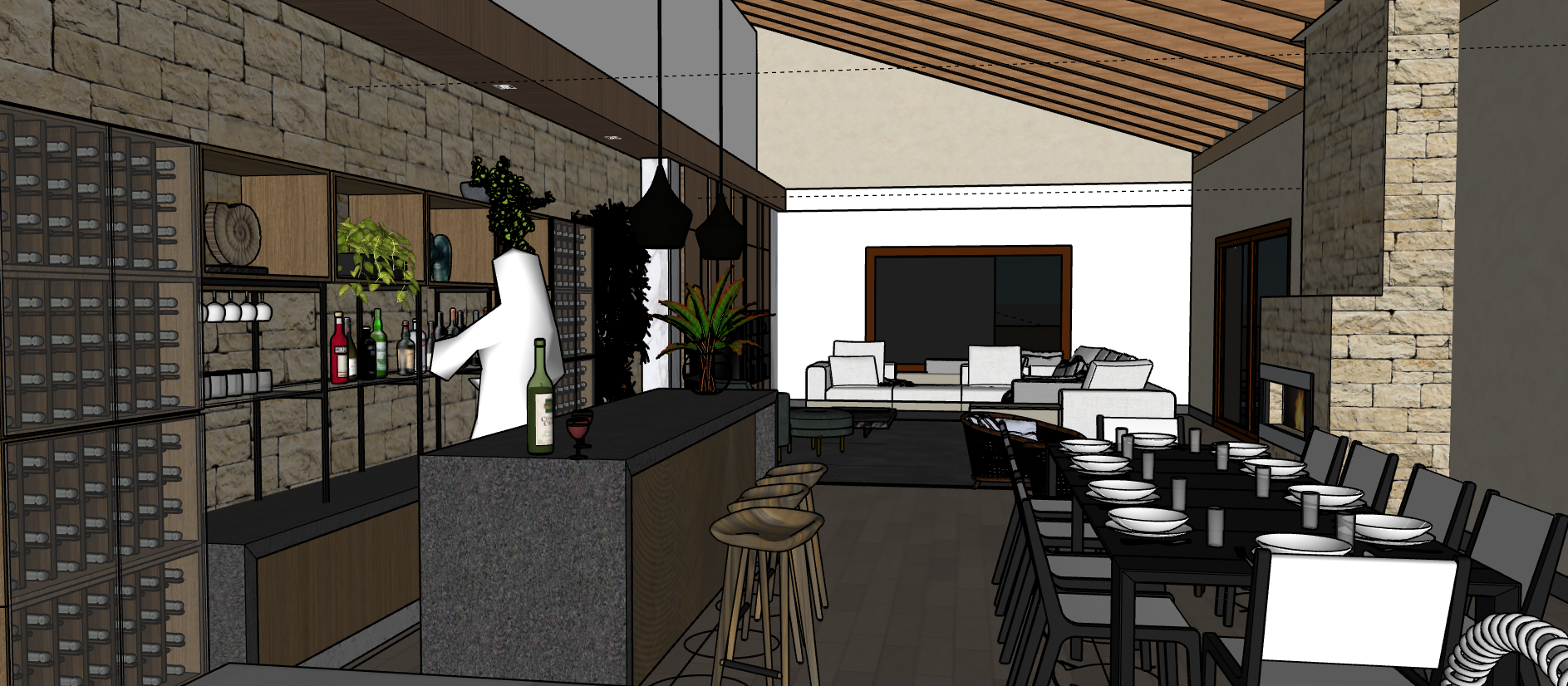 salon comedor con zona de bar en una vivienda unifamiliar de campo en espa a la cubierta es de madera render interior realista