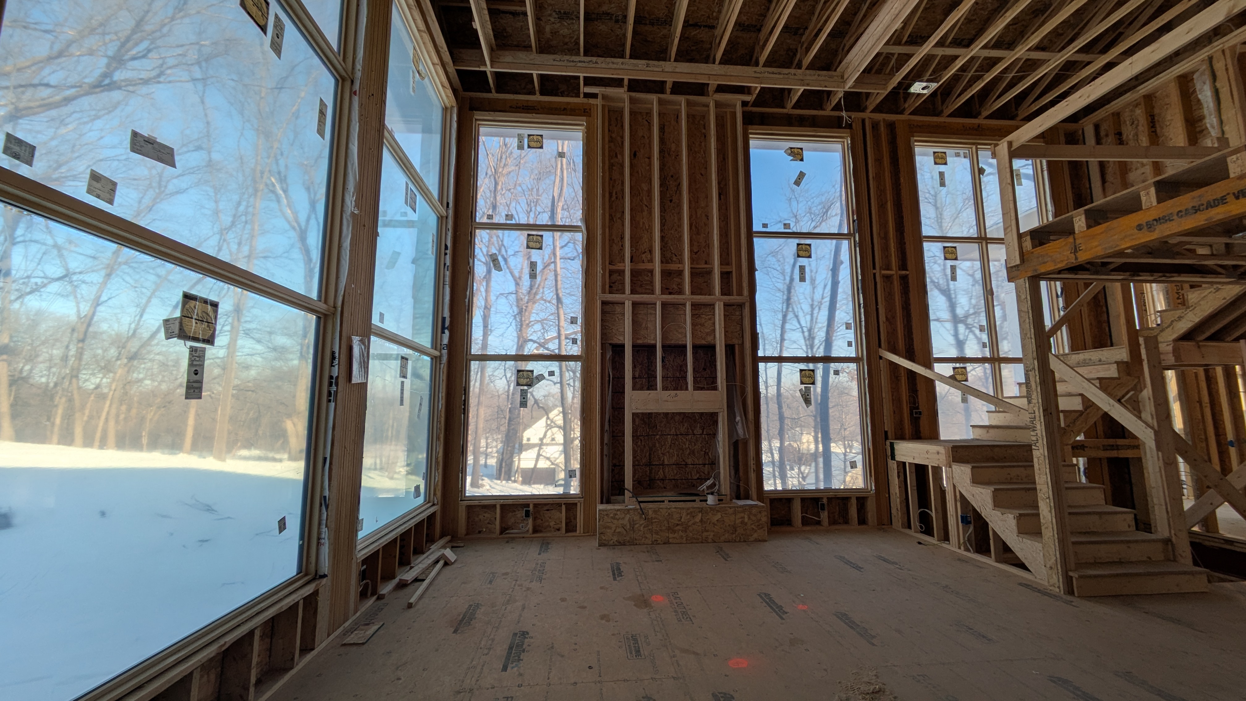 render a luxury modern living room with minimalistic furniture large clear windows with black frames reveal a serene nature landscape and full trees with a soft blue sky the fireplace has a mantle and a rough cut stone surround that also goes all the way up to the ceiling the walls and ceiling are sheetrock not wood studs the walls are painted in white tan tones the ceiling has a recessed soffit with accent lighting around the perimeter there is a beautiful crystal chandelier hanging from the center of the ceiling in front of the fireplace the staircase has a black metal handrail with horizontal metal wires the warm bleached tones of the wood floors contrast beautifully with the cool blues and whites outside creating a peaceful inviting atmosphere add soft ambient lighting that accentuates the natural wood textures and enhances the tranquil ambiance