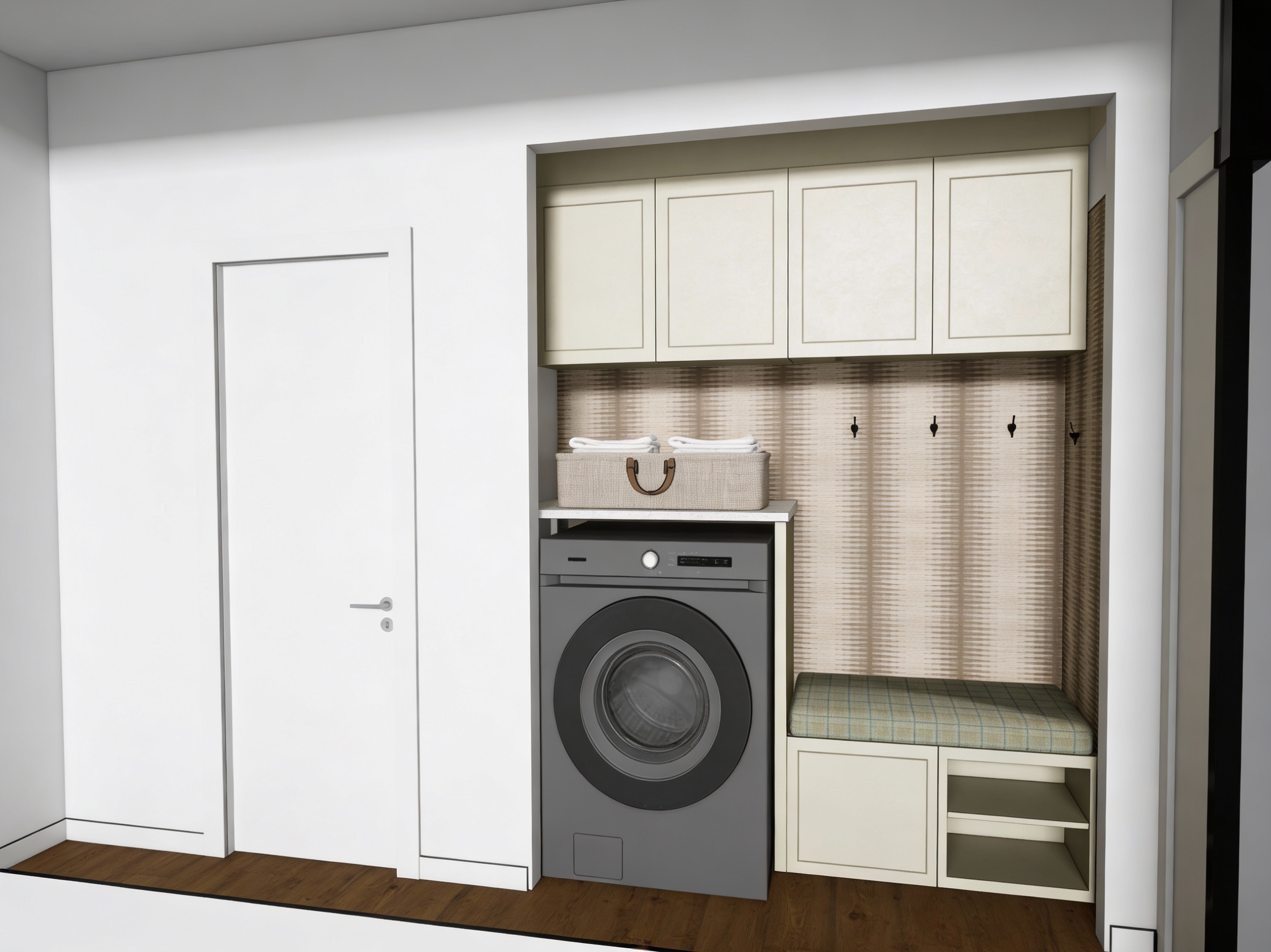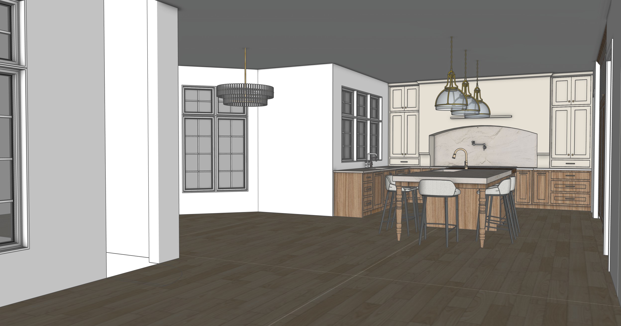 ultra realistic kitchen rendering based on a sketchup model realistic cabinetry materials soft beige painted range hood and hutches crystallo quartzite countertops with subtle veining accurate texture scale white oak floors with subtle wear and color variation matte painted walls with slight texture realistic fabric upholstery with visible weave physically accurate reflections and shadows soft indirect light global illumination professional interior photography crisp edges high detail clean modern aesthetic full frame camera 28mm lens