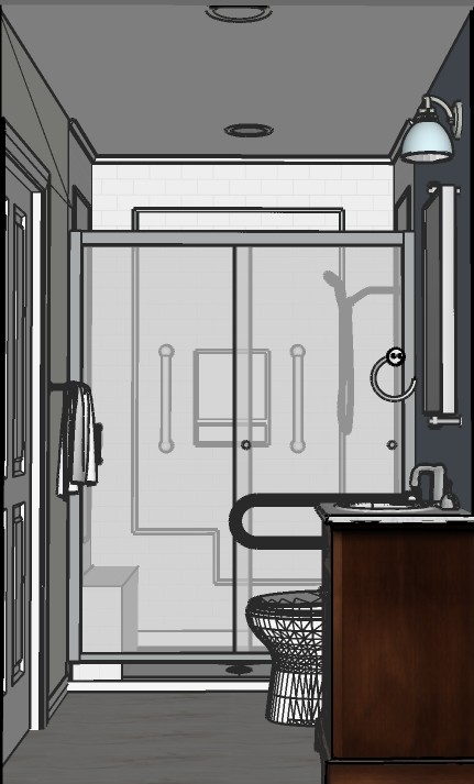 floor is a calcatta marble luxury vinyl tile 12x24 in a pattern brick the right wall is hale navy the shower is a white subway tile with a light blue frame around a shadow box and white niche on the back wall only the vanity light is a brush nickel with a light blue shade