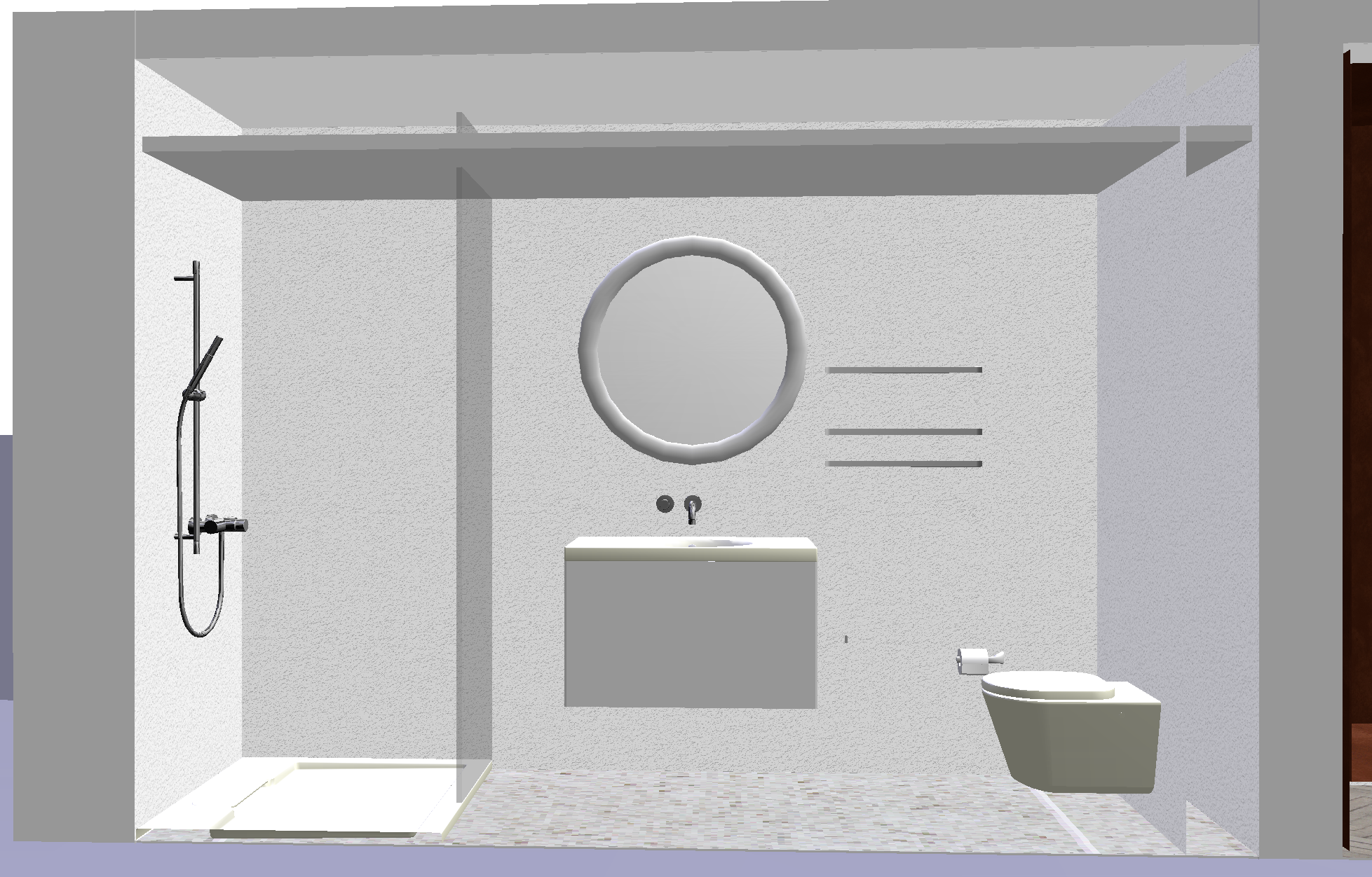 genau dieses rendering berarbeiten fotorealistisches innenraum foto exakt dieselbe perspektive und kameraposition wie das hochgeladene referenzbild 100 identische raumgeometrie exakt gleiche m belanordnung weiches nat rliches tageslicht raum k nstlich ausleuchten sanfte realistische schatten realistische materialien stoff mit leichten gebrauchsspuren hochwertige oberfl chenreflexionen lavabo aus marmor collemandina grigio in braungrau dunkel dahinter eine vola wandarmatur edelstahl vollkommen rahmenloser und hinterleuchteter spiegel links neben dem lavabo ist die dusche armatur ersetzen mit thermostatmodul axor select 460 90 mit stabhandbrause und grosser brause mit anschluss aus der wand alles in edelstahl geb rstet an der hinteren wand eine nische dellco in box luna in der gr sse 30x30cm mit led licht w nde in der dusche und boden collemandina grigio in braungrau alle anderen sichtbaren w nde sind sichtbeton moderne toilette vertigo wandh ngend in farbe sabbia tecelux bet tigungsplatte toilettenpapierhalter in edelstahl an der wand rechts von der toilette schwarze steckdose rechts vom lavabo schwarze runde deckenspots sehr moderner minimalistischer look nat rliche farbwiedergabe golden hour feeling hell ausleuchten das bild muss wie eine professionelle fotografie aussehen es soll ein echtes und reales foto sein canon eos r5 35 mm festbrennweite f 2 8 hyperrealistisch dslr qualit t raw aufnahme 8k aufl sung extrem scharf perfekte tiefensch rfe professionelle architekturfotografie