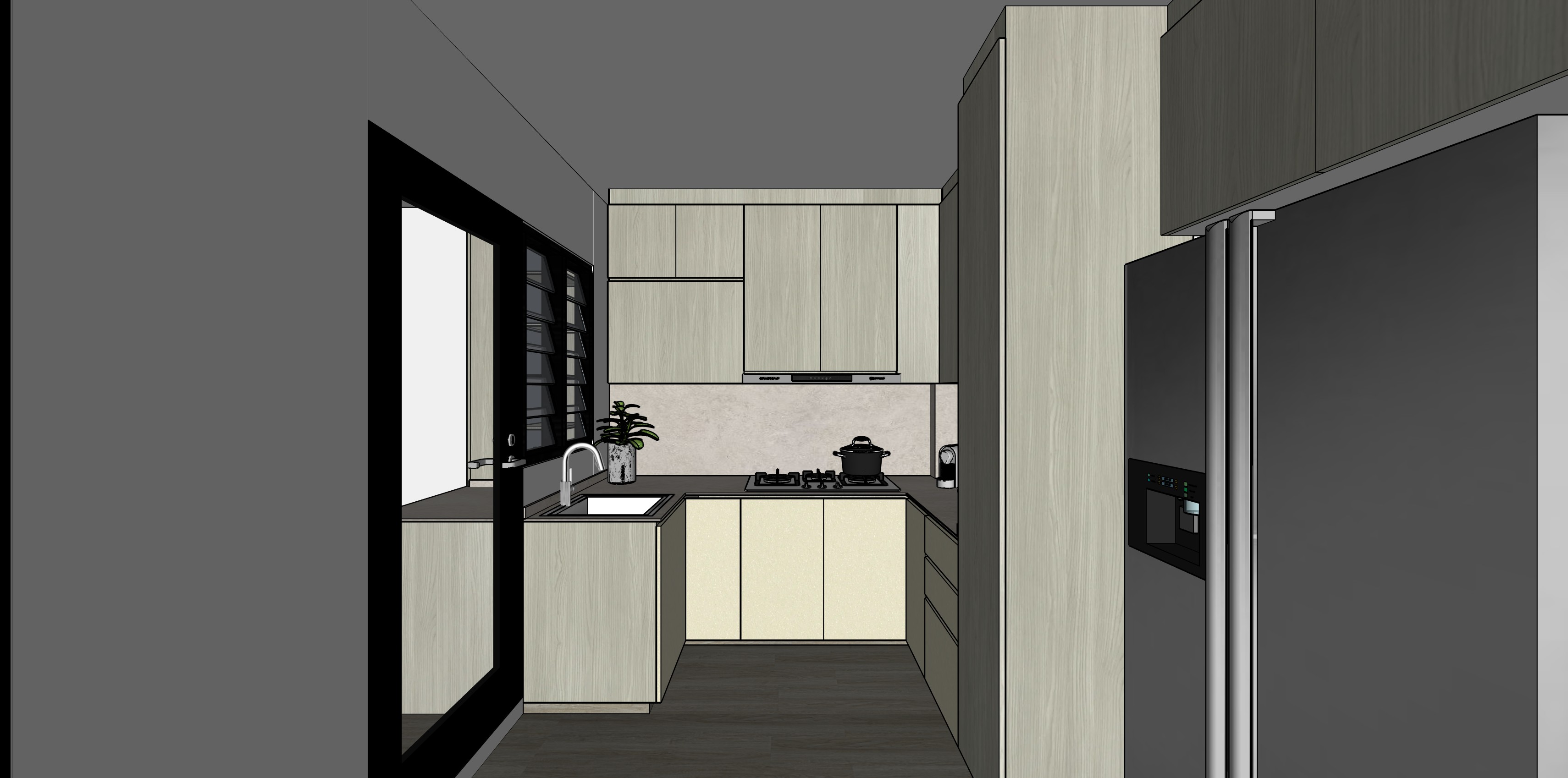 maintain all objects in frame walls and ceiling are white floor is timber planked vinyl add in led warm lighting below top cabinets backsplash is grey castillo finish bottom cabinet doors should look like lime wash finish add in a single surface mounted downlight on the ceiling