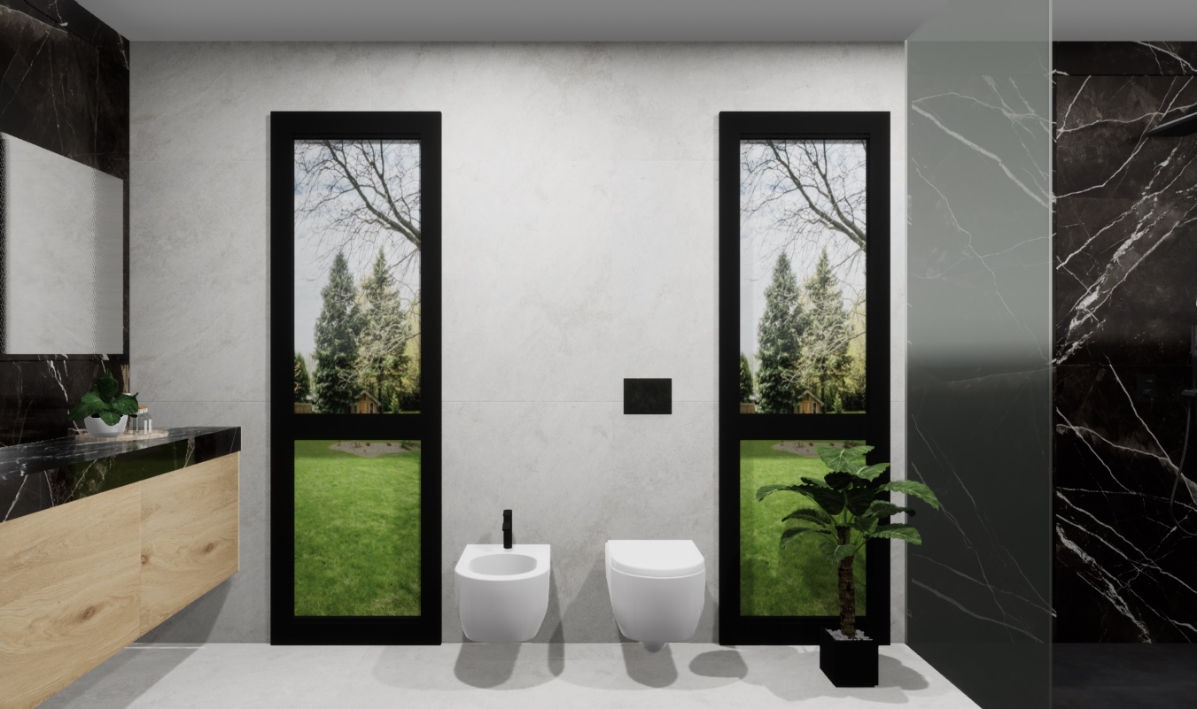 lifestyle shot of a family concrete polished floor bathroom featuring a wooden oak vanity with a black marble worktop in the centre a wall hung white bidet with a black faucet and white wc with a black flush plate on the wall on the right hand side the shower enclosure features black marble walls flat black tiled floor and a clear glass shower screen with other details such as white towels hung in the wall and black shower taps lighting to be a warm sunny day with views through window to a private garden with grass and pine trees in the background