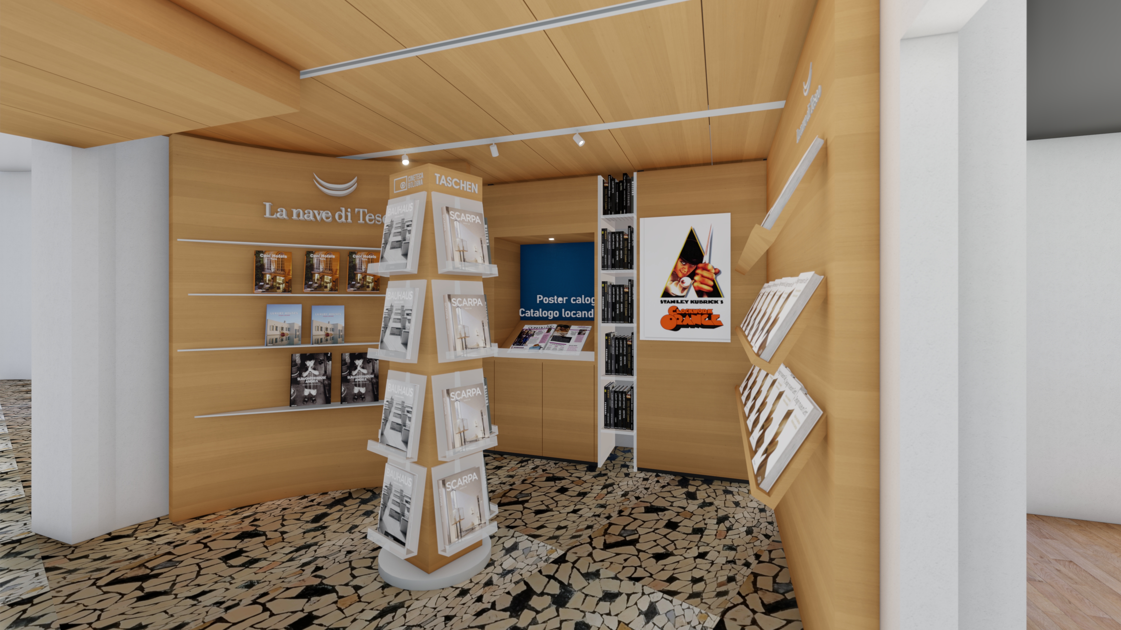 interno di un book shop con luci soffuse non troppo forti no illuminazione naturale pareti e controsoffitto rivestite con pannelli in legno chiaro non lucidi non aggiungere geometrie e non modificare textures