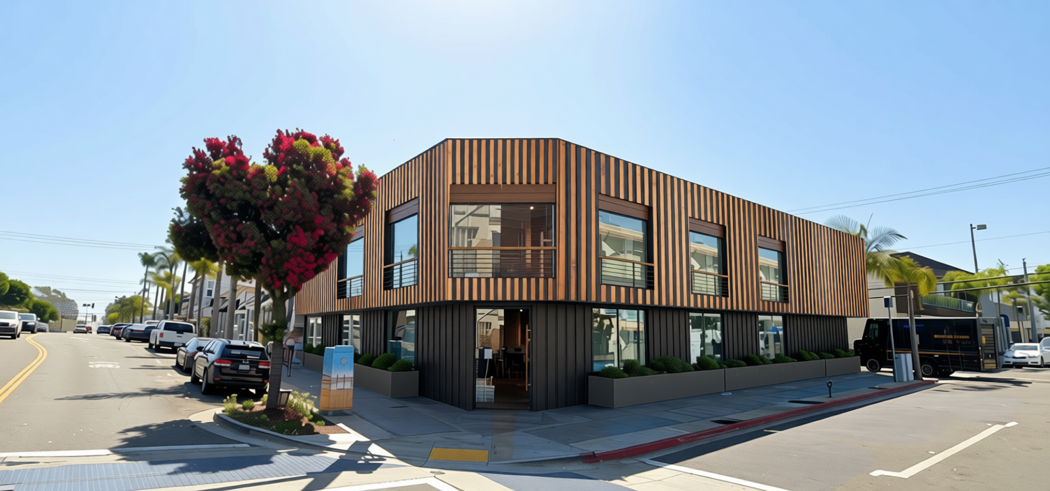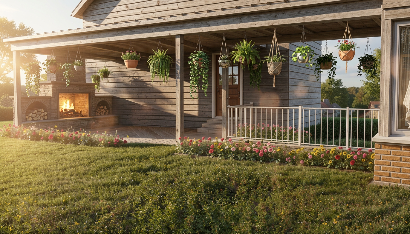 keep image exactly the same but change siding to white vinyl siding and add hanging plants to overhang