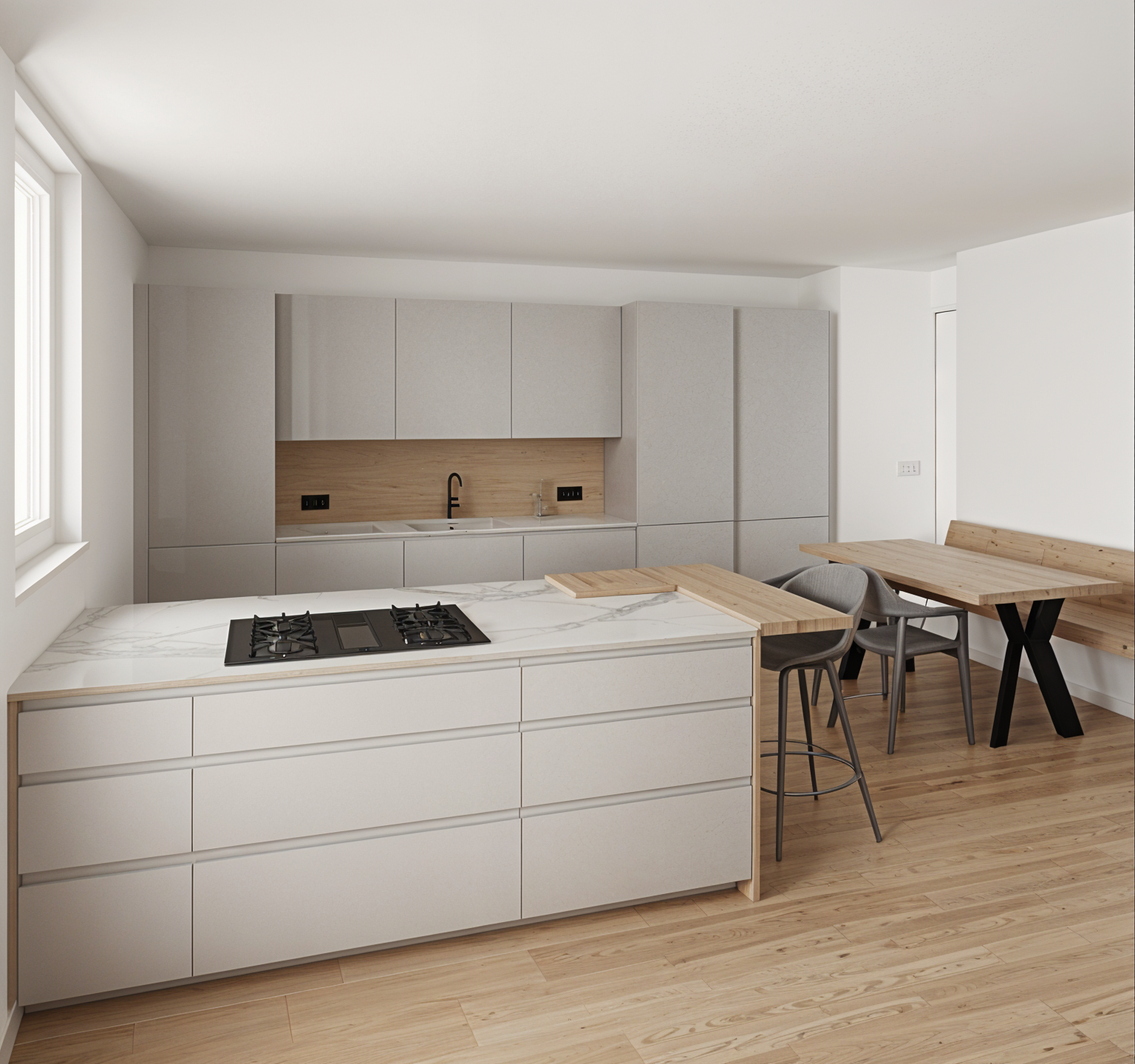 make a realistic visualisation of this livingroom dining room and kitchen in the background open space full of light bright furniture pastel accents everything in correct dimensions and spaces use exactly the same furniture lamp and everything as on the picture