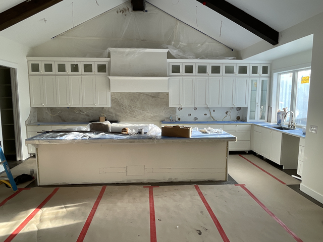 do not change the cabinets in any way preserve the exact cabinet colors materials finishes dimensions door and drawer styles hardware spacing alignment and all geometry exactly as shown do not alter the countertop shape backsplash appliances flooring lighting fixtures or wall structure only remove the construction materials clutter and mess from the scene clean the room and make it look finished and staged add a few simple tasteful home accessories appropriate for the style of the space but do not add or remove any furniture windows or architectural elements maintain the original lighting direction and realism enhance clarity and polish the photo while keeping the cabinetry and room design completely unchanged do not alter the lighting to keep the cabinet colors as they are in the image add flooring add dishwasher to the right of the sink put a range below the hood add stone on the back of the island add stools to the island