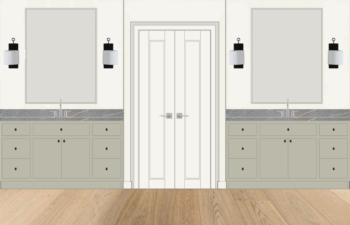 photorealistic rendering of bathroom with iron sconces polished nickel faucet in soft daylight