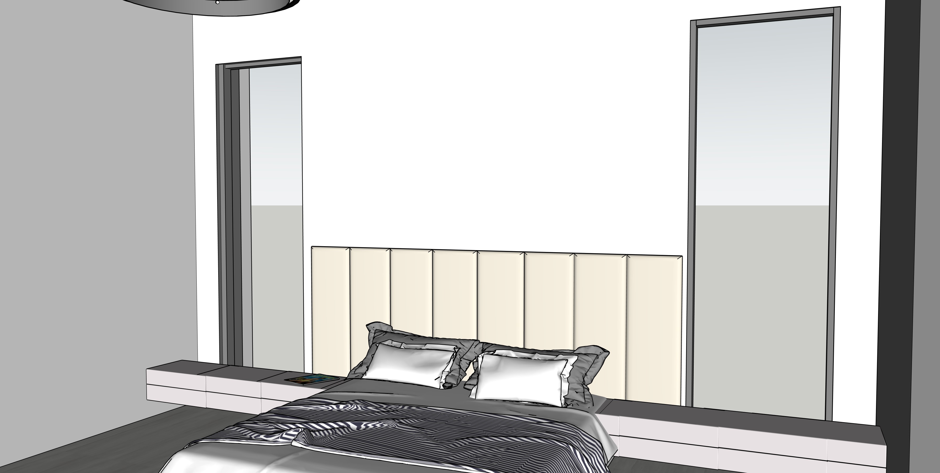 render a modern bedroom with greige upholster headboard floor to ceiling windows that you see the arizona landscaped backyard flaoting nightstands in white laquer on either side of bed greige and beige modern bedding floor that looks like concrete white walls lighitng at ceiling side of walls to light wallpaper that looks like marble