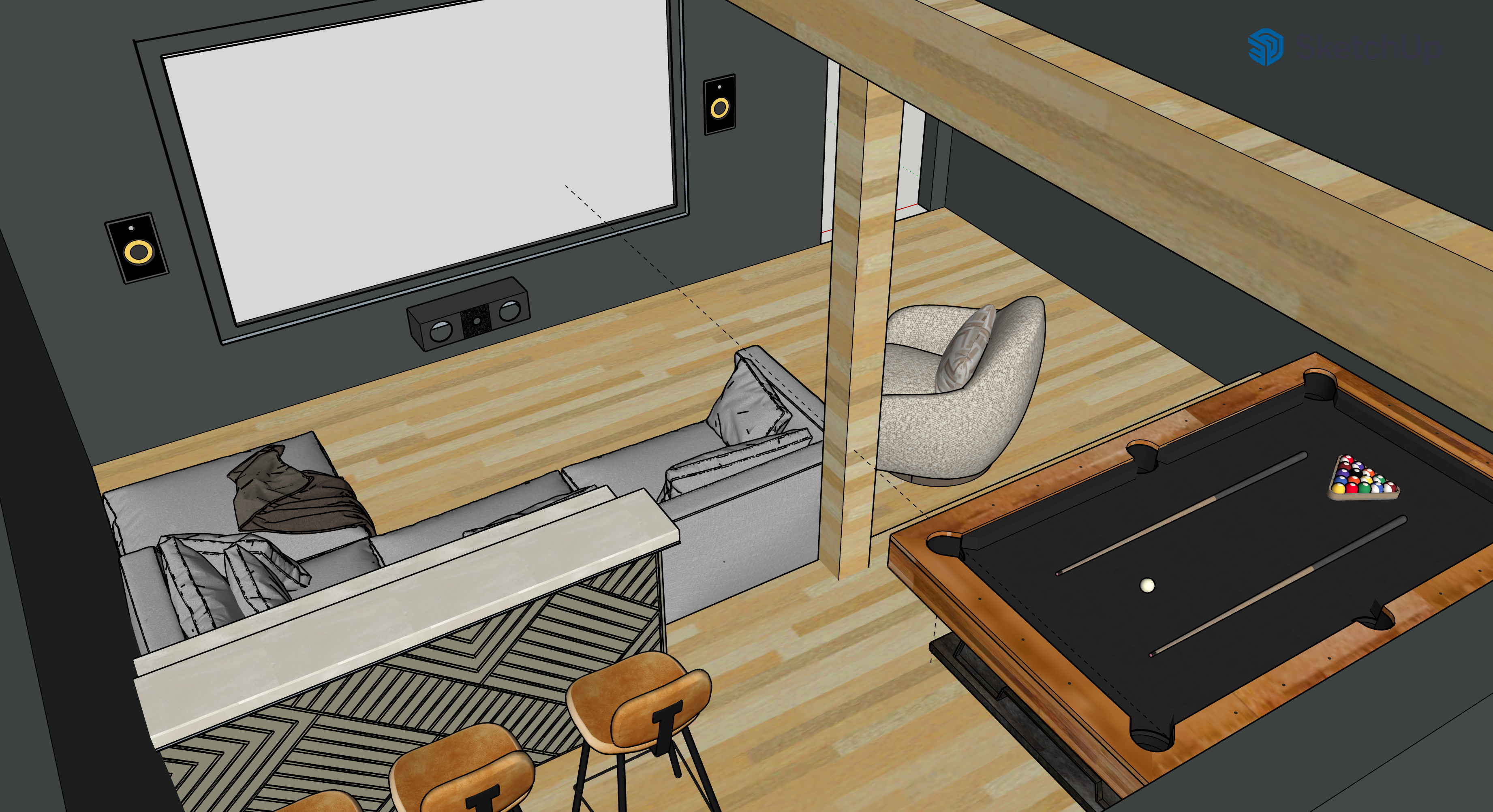 expand view to wide angle see more of the pool table bar table and bar stools sectional sofa floor is a rustic wide oak floor add recessed lighting for movie room overall feeling rustic luxurious