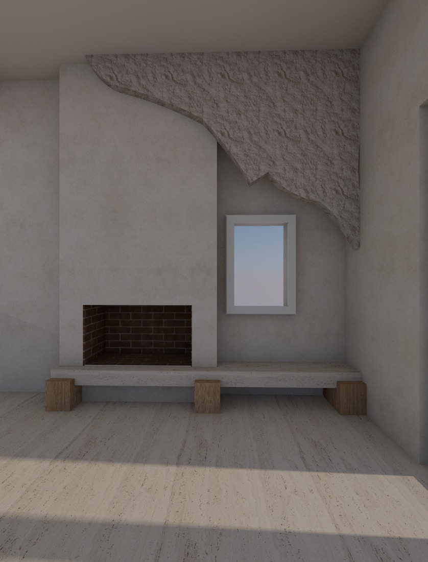 create a highly realistic render of a bedroom with a calm and serene atmosphere the lighting is soft and natural creating a peaceful and balanced mood with minimal shadows above the fireplace there is a sculptural composition of raw stone in an irregular organic shape extending across the wall as a design feature the stone appears natural and unrefined adding texture and visual interest the wall is finished in a very light beige polished microcement creating a smooth and minimal background that enhances the natural materials ultra realistic render high resolution interior design magazine photography style