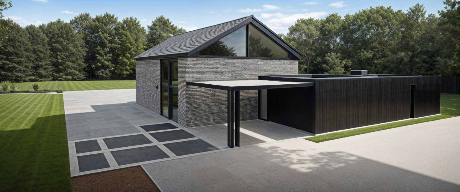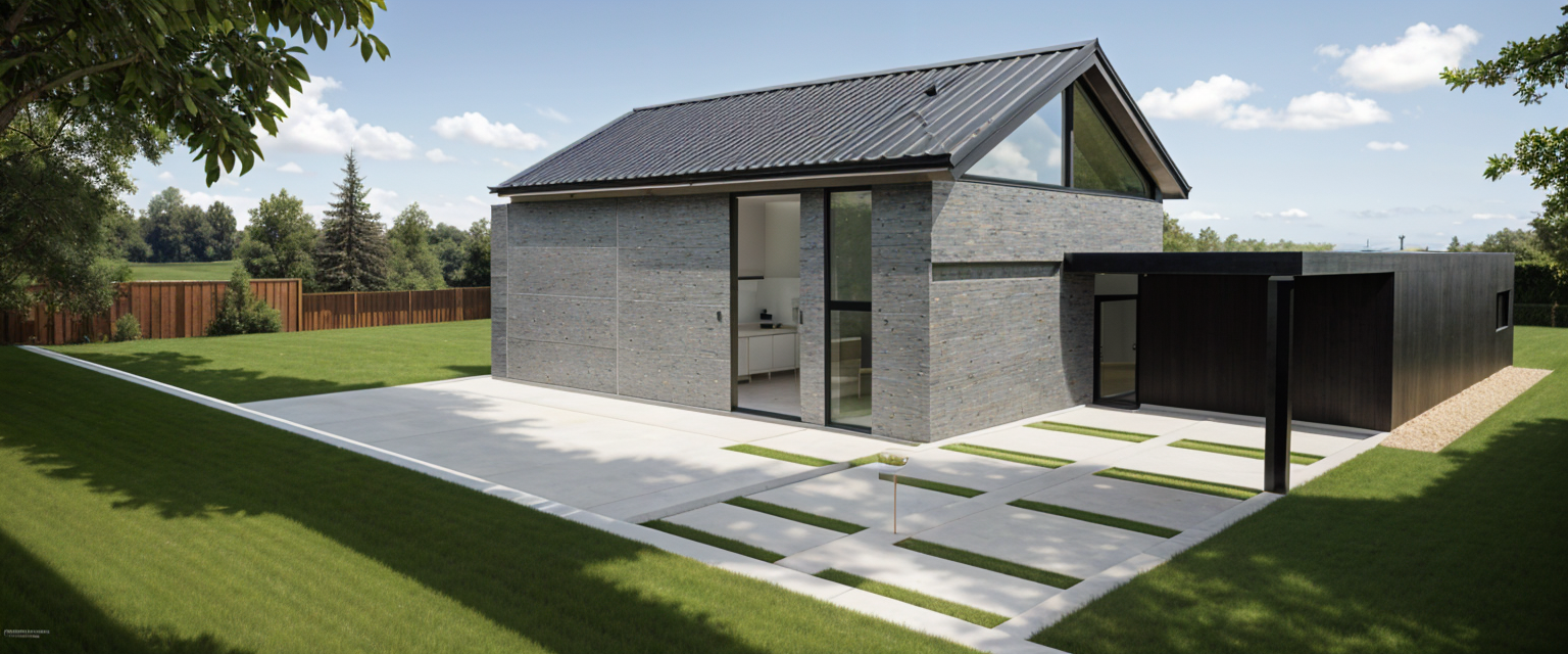 exterior shot sunny hillside neighborhood with several beige modern houses featuring clean lines and large windows reflecting sunlight the well maintained vibrant green grass covers the sloping landscape surrounded by lush trees in various shades of green creating a serene and inviting atmosphere the sky is a brilliant blue dotted with fluffy white clouds casting soft shadows across the scene complementing the peaceful suburban setting architecture