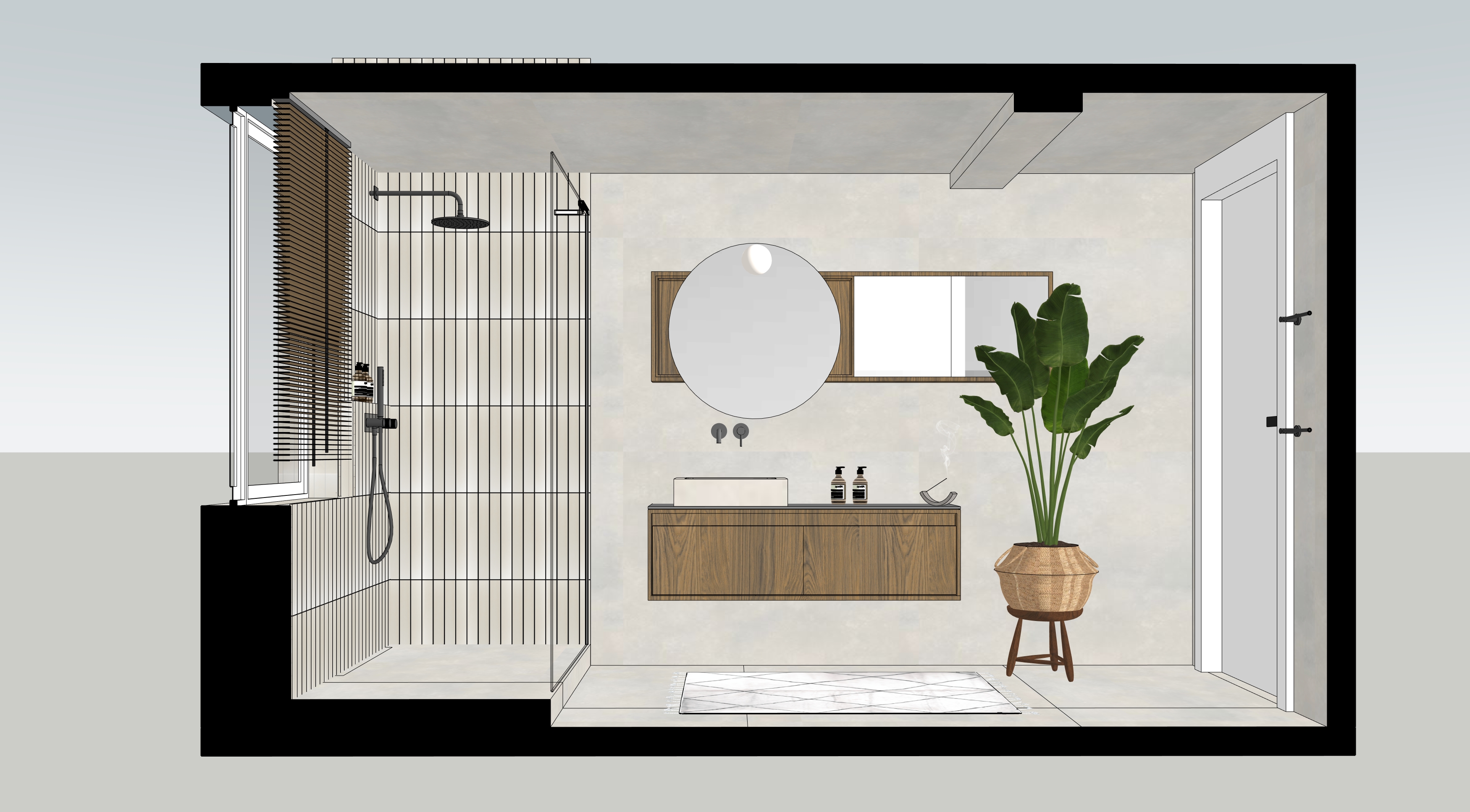 photorealistic bathroom visualization prompt modern minimalist bathroom interior full frontal elevation view ultra realistic architectural visualization 4k resolution ray tracing global illumination natural daylight entering from the left window soft realistic shadows high detail pbr materials clean balanced composition shower zone on the left floating vanity in the center decorative plant and door on the right walls finishes main walls finished in light warm beige microcement smooth matte surface subtle cloud like tonal variations seamless microcement application without visible joints behind the vanity continuous microcement feature wall ceiling in matching light warm tone smooth finish floor in large format light beige tiles matte texture minimal grout lines shower area left side walk in shower with frameless transparent glass panel shower walls clad in equipe corsica vertical tiles slim elongated format color warm off white ivory satin ceramic finish fine contrasting grout lines emphasizing vertical pattern floor in matching neutral tone tiles shower fixtures wall mounted rainfall shower head in graphite gunmetal finish brushed texture matching hand shower with flexible hose concealed mixer in brushed graphite gunmetal minimal black metal shower shelf with amber glass cosmetic bottles window in shower area white frame natural wooden horizontal blinds in warm oak tone vanity sink area center floating vanity cabinet natural oak veneer warm medium oak tone with visible wood grain horizontal grain direction matte satin finish handleless fronts thin shadow gap under cabinet sink rectangular vessel sink made of beige marble soft cream beige tone with subtle natural veining honed matte stone finish thick solid edges for luxurious appearance faucet wall mounted mixer in brushed graphite gunmetal finish minimal cylindrical geometry countertop accessories two amber glass soap dispensers with black pumps minimal ceramic incense holder with delicate smoke trail mirror organic asymmetrical mirror shape thin wooden frame in matching oak tone natural matte finish realistic glass reflection no visible led strip in this version natural lighting emphasis decorative element large tropical strelitzia plant bird of paradise rich deep green leaves with visible veins natural woven rattan basket planter elevated on wooden mid century stand strong natural sunlight casting dramatic leaf shadows on microcement wall door right side minimal white interior door matte black modern lever handle clean modern trim lighting mood strong natural daylight entering from left window soft indirect bounce light clear shadow definition from plant leaves no harsh artificial lighting calm spa like atmosphere warm neutral color balance style keywords modern minimalist japandi influence beige marble sink microcement walls equipe corsica tiles graphite gunmetal fixtures oak veneer cabinetry natural daylight high end architectural photography rendering settings ultra realistic pbr materials microcement roughness variation marble normal map ceramic tile gloss map high dynamic range physical camera settings sharp focus clean architectural framing professional archviz quality 8k textures