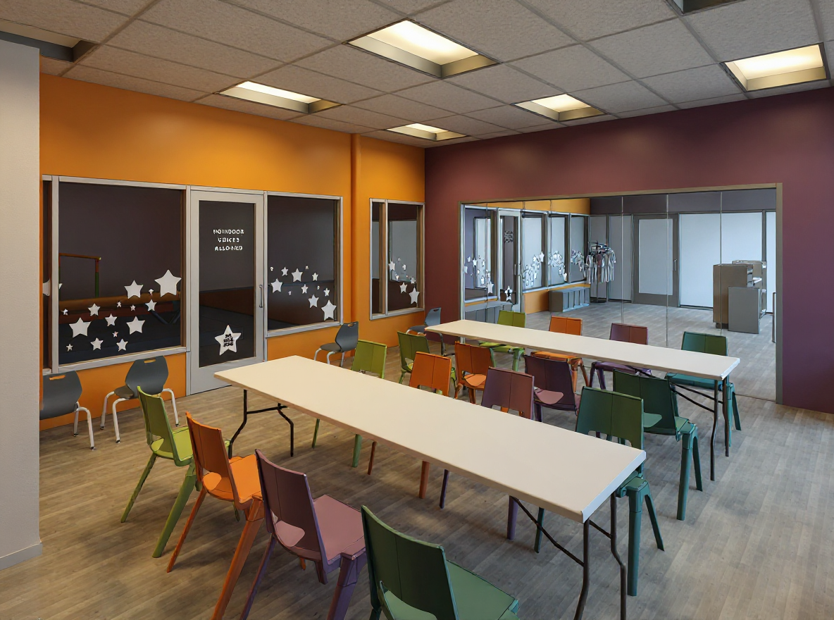exterior shot render an architectural scene featuring a modern urban building complex the left building is constructed from red brick offering a classic and textured appearance the right buildings are modern and sleek made from dark gray concrete emphasizing contemporary design integrate a spiral staircase on the central building with a subtle mint green accent for a touch of elegance the tree in the foreground is lush with deep green foliage and a dark brown trunk adding natural contrast against the urban backdrop the ground is paved with smooth light gray concrete create an atmosphere of tranquility and sophistication under a clear blue sky with soft natural daylight