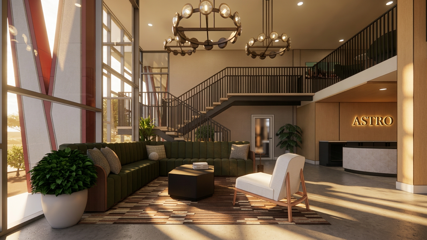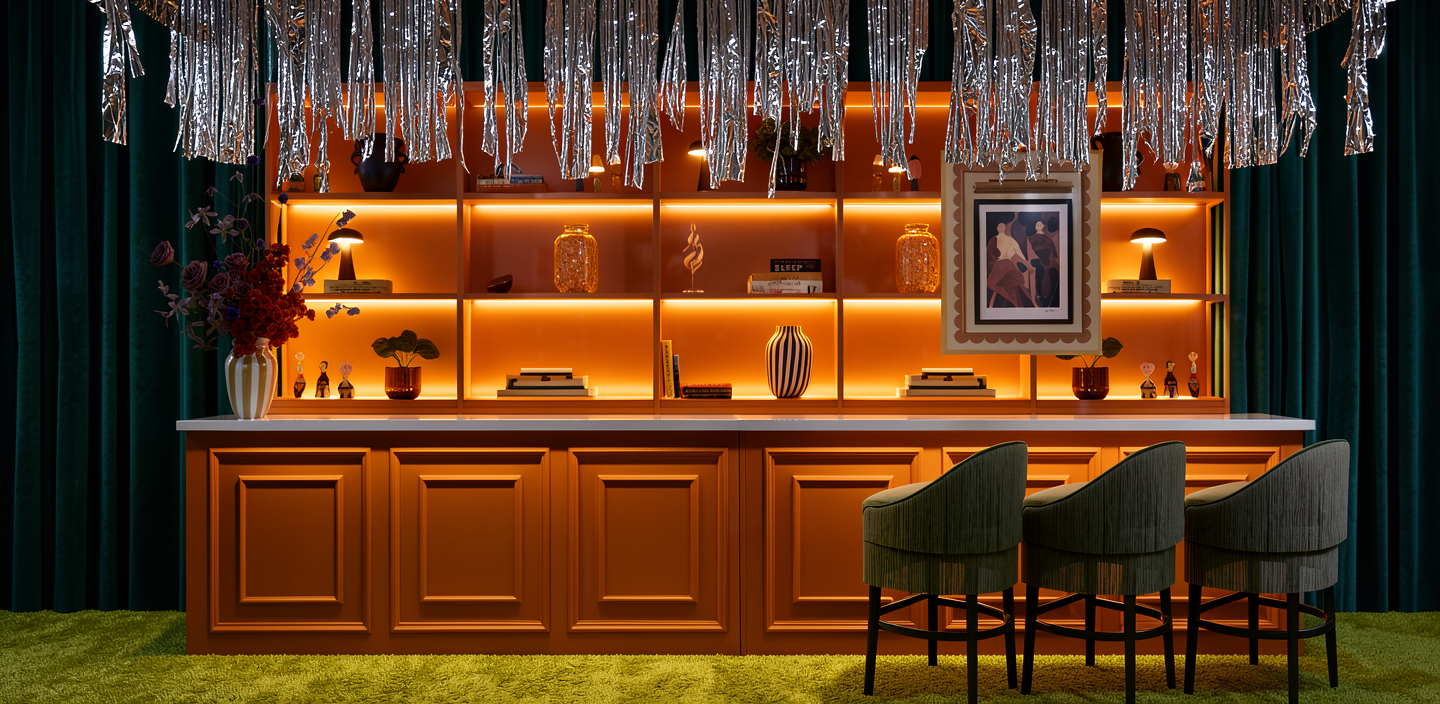 chartreuse carpet teal velvet drape wall up lit nighttime shelves under lit bar front is pink