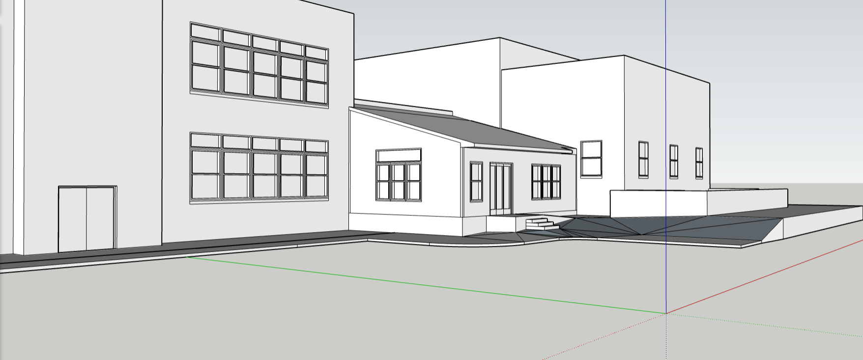use this exact camera angle from the sketchup model of the bethlehem manor residential entry addition enhance the rendering with the following material and design specifications residential addition pitched roof volume exterior cladding james hardie horizontal cement board siding painted a soft off white or warm neutral e g arctic white or cobble stone roof medium gray standing seam metal or dimensional asphalt shingles windows black framed double hung or fixed casement windows stone sills natural color stone light gray or limestone tone entry door black framed glass or modern neutral tone to complement windows surrounding original building large flat roof massing exterior painted brick soft peach hue very subtle almost white with warm undertone think peach blossom or pale apricot stone sills remain natural color hardscape sidewalks and curb ramps in light concrete gray front steps and ramp platform in slightly darker gray tone for subtle contrast lighting scene daytime soft overcast lighting for minimal shadow contrast or golden hour for warmth depending on mood camera angle and perspective exactly as shown in the attached image architecture