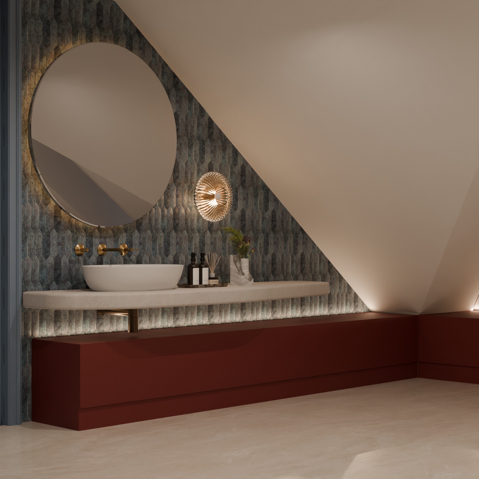 change the tiles on the wall to red instead of blue but keep the same design of tiles and overall contrast of the tiles not plain red also change the door to white