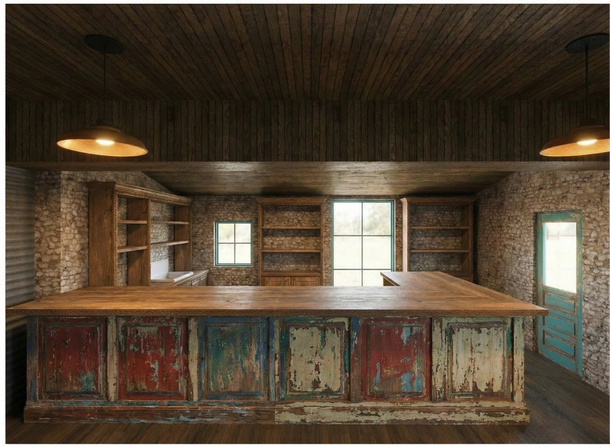 i want the lower part of the bar to be a layered mexican rustic paint with reds and small amouts of greens and creams peeking through chippy and antique look do not do each panel a different color all the colors need to be mixed on each panel with lots of wood still showing through
