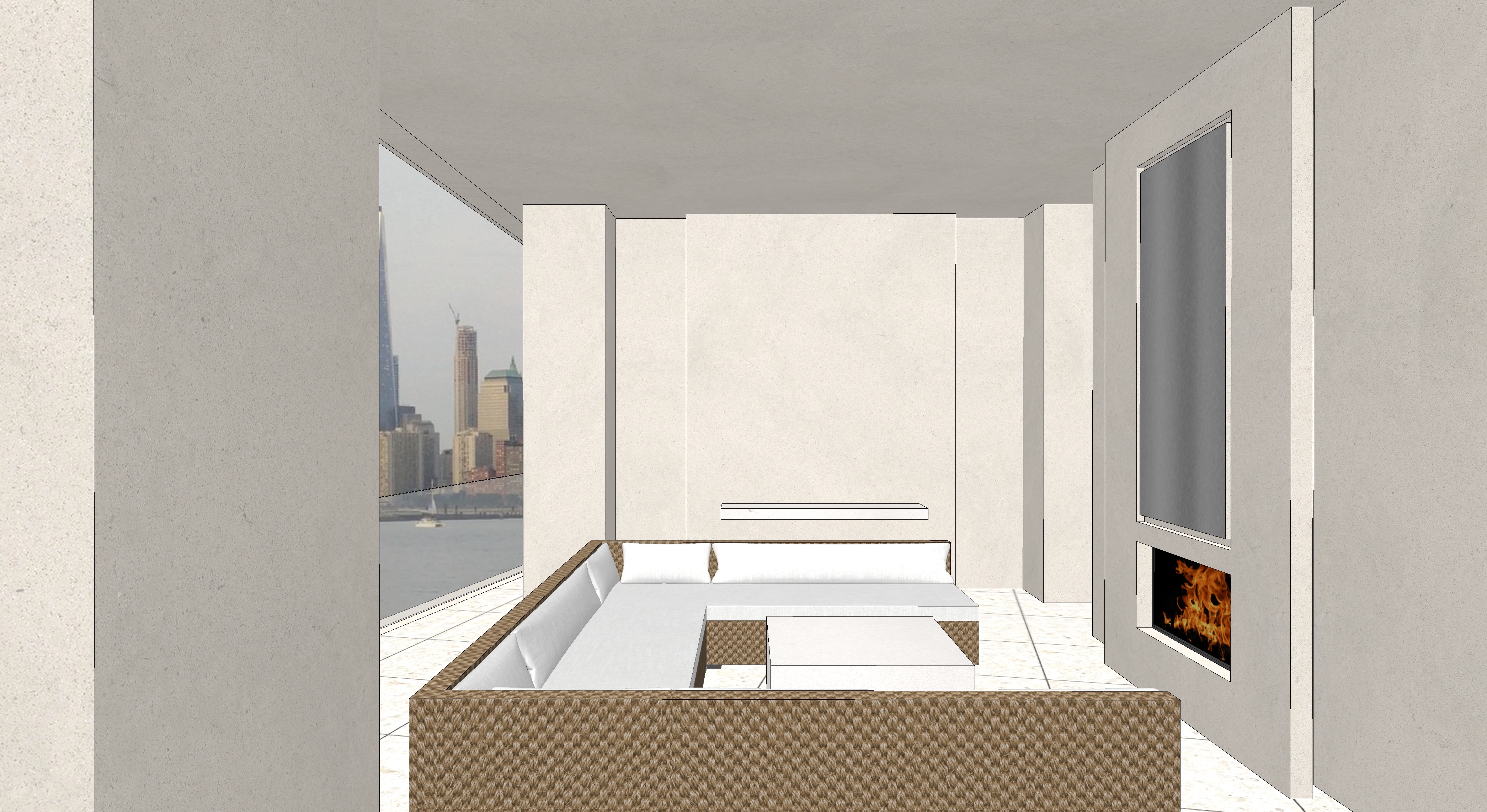 covered outoor area with fireplace mirror over with led liht emitting behind it blank wall floats off back wall by 4 inches allowing soft light to glow from 2 vertical slots left and right wicker and linen furniture wraps around a stone coffee table
