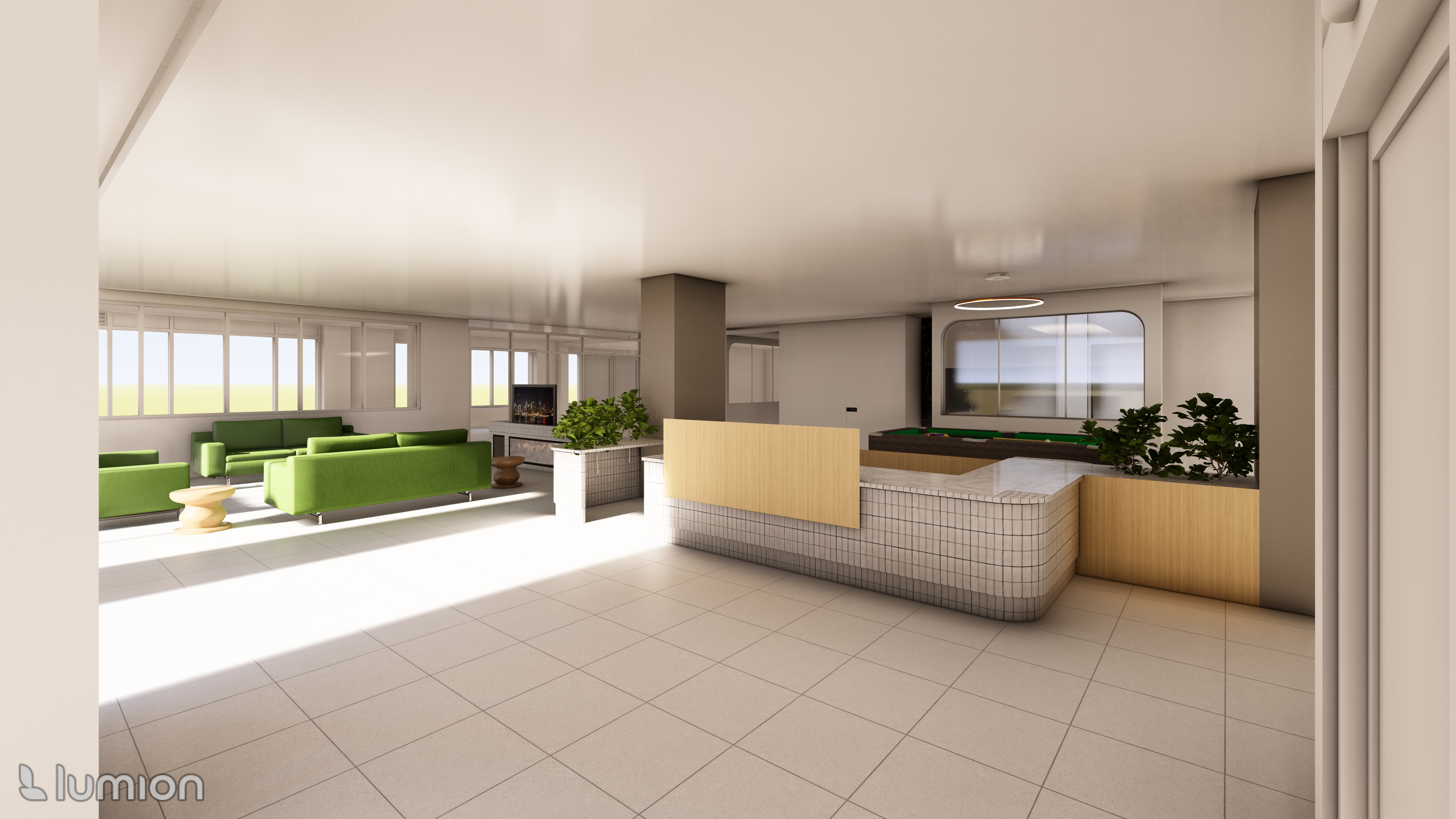 use the uploaded image as a strict base reference do not change the following under any circumstances layout furniture positions circulation paths camera angle proportions or scale spatial relationships between elements the sofa must remain on the left side in its current position the reception desk must remain in its current position do not move remove or relocate any major furniture only enhance materials lighting and styling goal transform the space into a high end warm hospitality inspired lobby for a 55 residential building while strictly preserving the existing layout materials mandatory upgrades replace floor finish with large format matte stone or porcelain reception desk refined fluted light wood panel with quartz or marble countertop add subtle brushed gold accents add soft wall textures or paneling avoid flat plain walls seating area left side keep position keep sofas exactly where they are change upholstery to muted sage or olive green not bright green add cushions and layered textures add a large area rug under the seating zone add 2 3 small side tables fireplace keep position enhance with a minimalist stone finish add integrated warm lighting lighting critical warm lighting 3000k add recessed ceiling lights add indirect cove lighting add a decorative suspended light fixture near reception increase contrast with soft shadows and depth avoid flat lighting people add 2 to 5 elderly people ages 60 80 sitting in the lounge area or near reception natural candid positions not posed do not block circulation or main views do not overcrowd the space styling add subtle greenery in existing planter areas keep decor minimal and clean maintain a calm uncluttered environment rendering style photorealistic high resolution soft shadows global illumination realistic reflections warm tone cinematic but natural