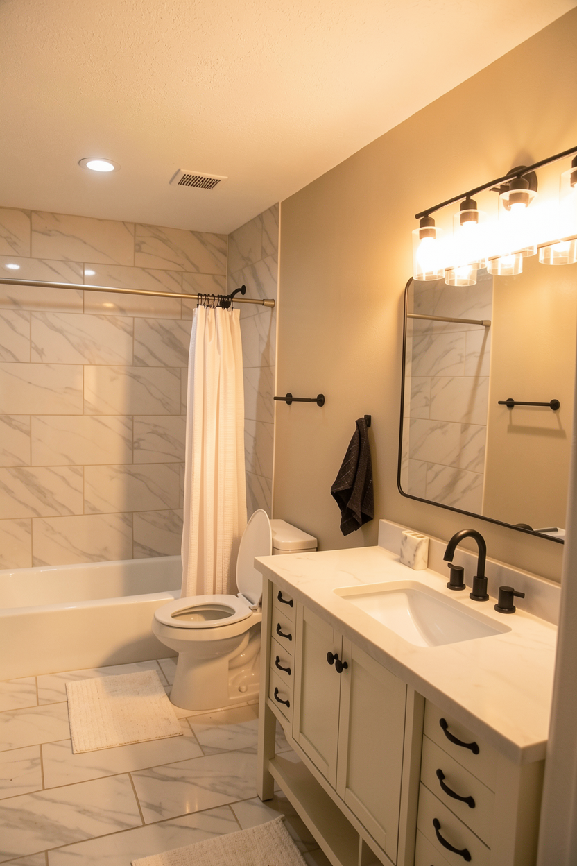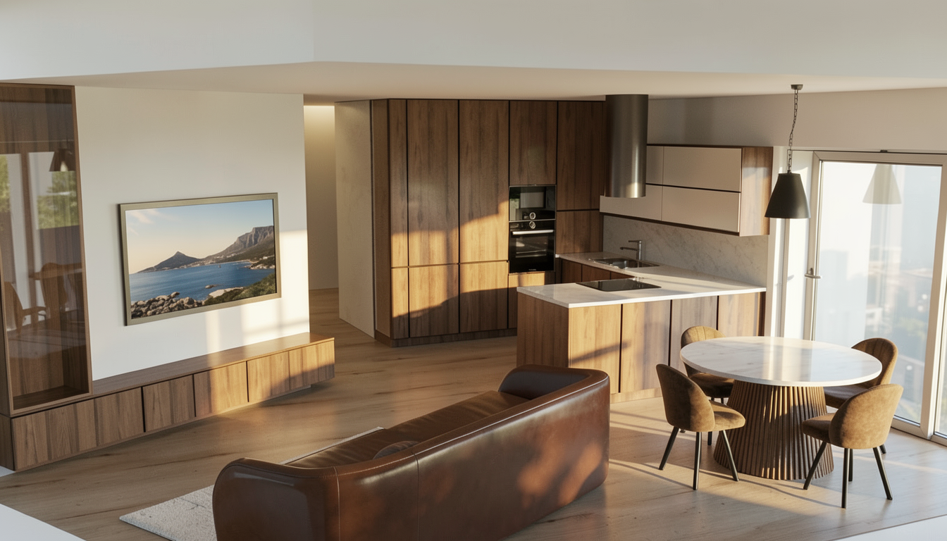 ultra realistic luxury showroom kitchen render preserve exact geometry layout proportions and camera angle from the original image do not modify any architectural elements or furniture design materials lower cabinets and right wall premium dark walnut wood deep tone rich grain matte satin finish perfectly seamless upper cabinets smooth matte beige lacquer ultra clean handleless backsplash refined beige travertine microcement soft natural variation floor high end oak flooring uniform planks matte finish countertop light premium stone subtle elegant veining lighting cinematic showroom lighting setup soft warm led strip under cabinets 3000k enhance ceiling led as a refined glowing frame soft diffusion no hotspots add subtle top spotlight emphasis on countertop area clean reflections controlled highlights luxury commercial mood styling very minimal staged look add 1 2 curated objects designer vase premium cutting board subtle decor piece everything aligned intentional no randomness rendering ultra photorealistic sharp high contrast but balanced slightly polished commercial look like minotti boffi catalog perfectly clean no imperfections