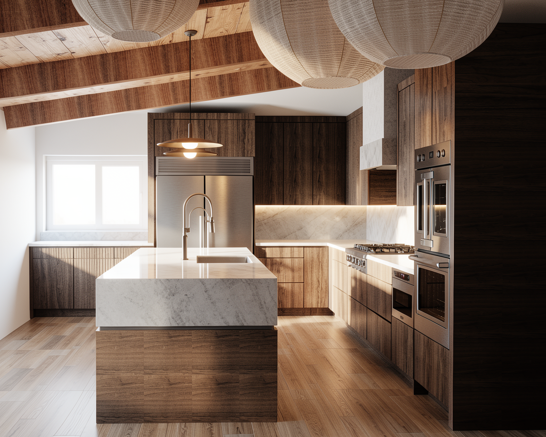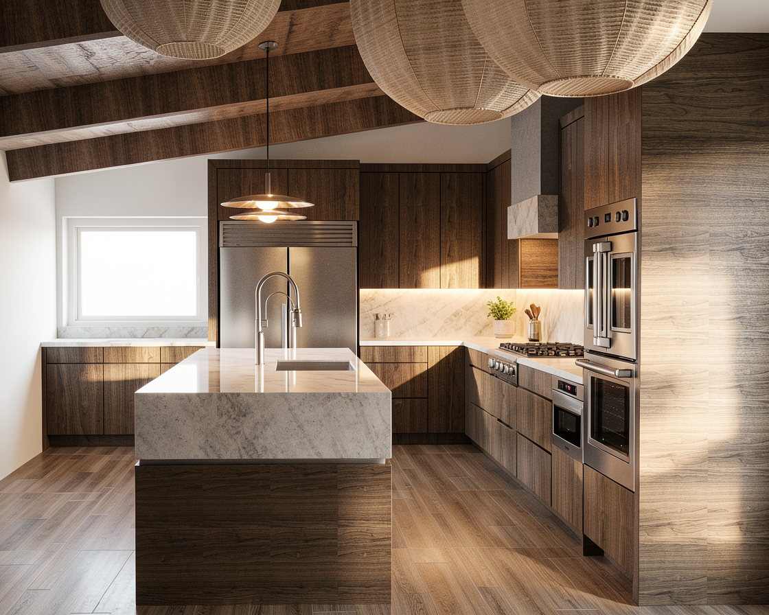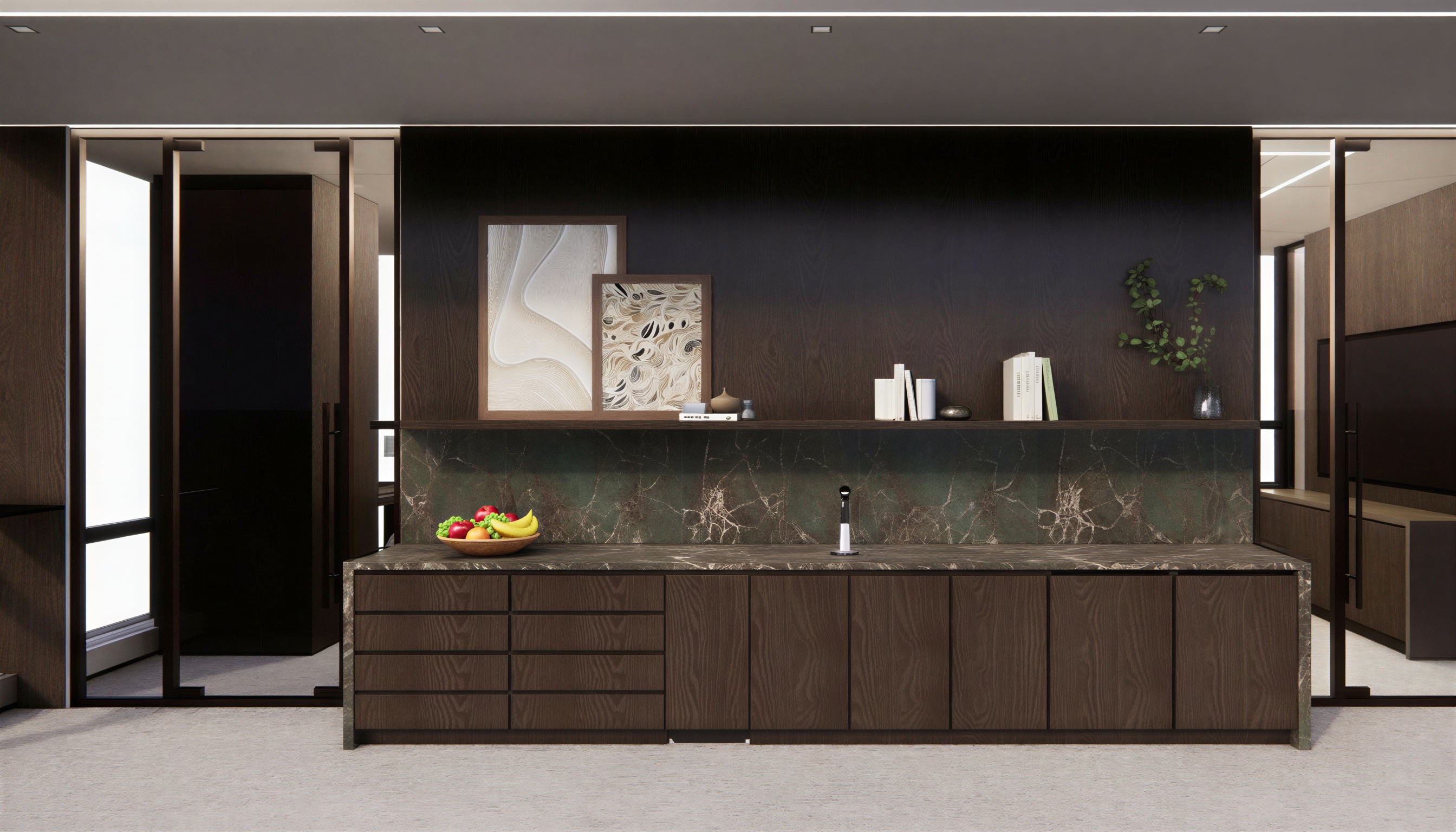 provide a photorealistic rendering keep all the elements proportions and materials as they are add linear light wash at wood wall