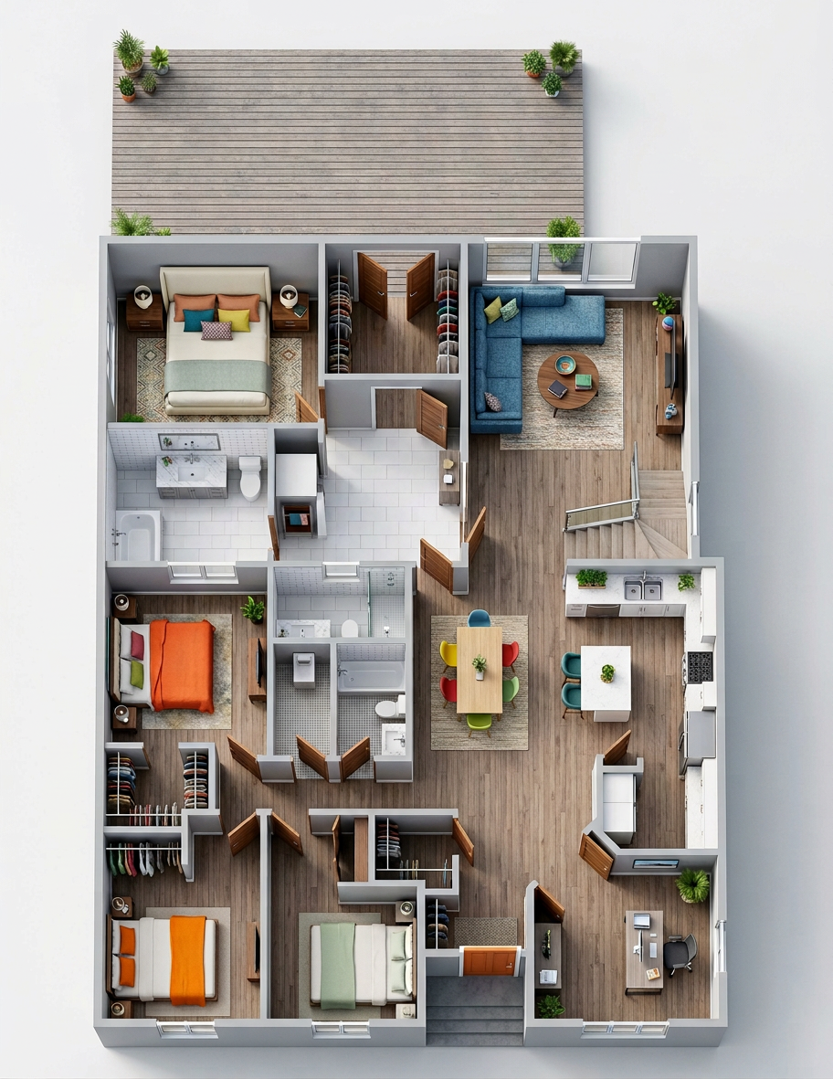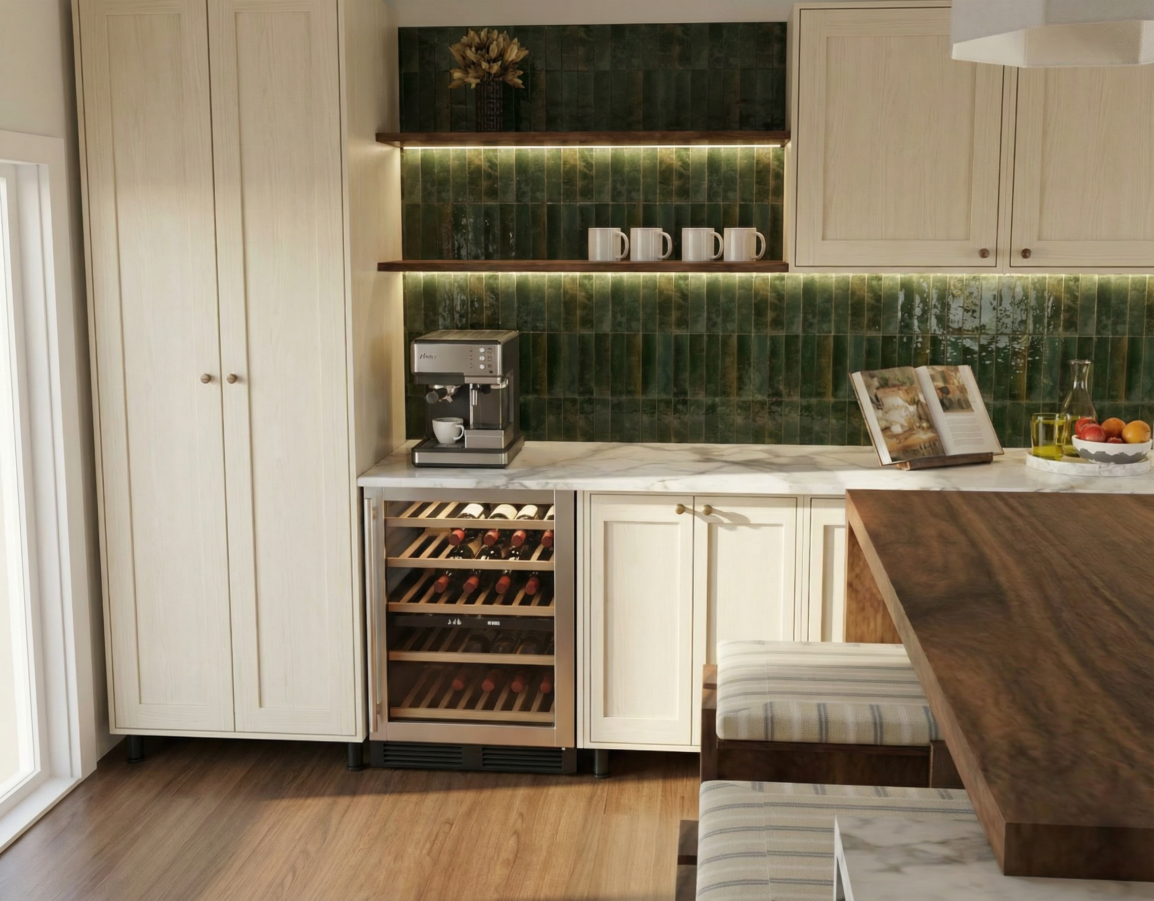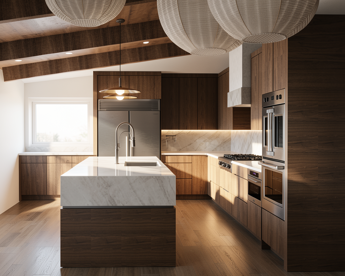 provide a photorealistic rendering keep all the elements proportions and materials as they are add linear light wash at wood wall