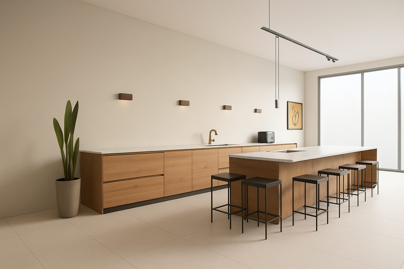 make this rendering photo realistic keep everything as it is natural bright golden daylight the floor and the chimney should be without texture smooth and in beige grey plaster carpet wool structure no gap between ceiling and curtains mid dark oak wood everything