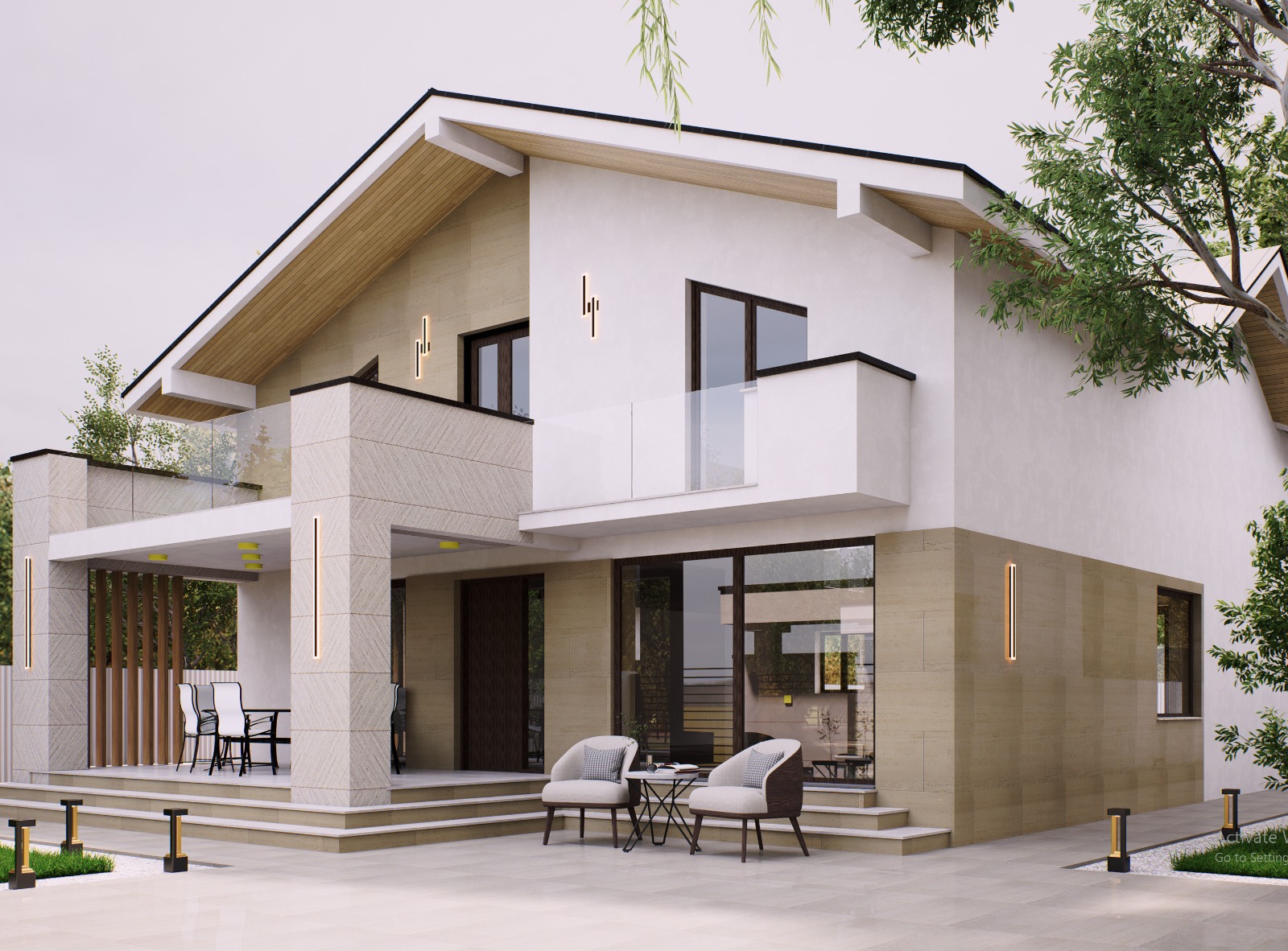 use the provided house image as the base apply travertine stone cladding only where the brown beige facade appears in the image the lower floor walls and the stone sections already visible keep the following elements exactly the same and unchanged the white plaster walls on the upper part of the house the zig zag textured pillars and terrace structure the glass balcony and balcony walls the roof shape and the wooden soffit under the roof windows doors lighting furniture and surroundings the travertine should look natural beige travertine stone with large rectangular slabs and subtle natural veins similar to modern mediterranean architecture do not modify the composition lighting camera angle or any other materials only replace the brown facade areas with realistic travertine stone
