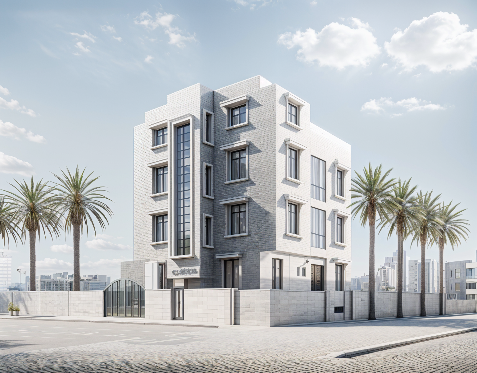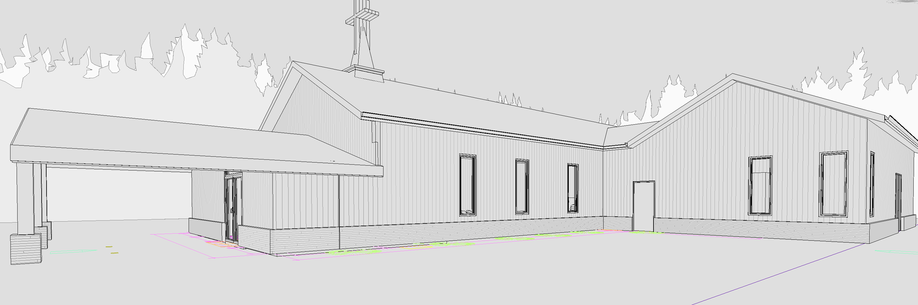 white hardie board siding metal roof long rectangular windows small parking lot country background architecture