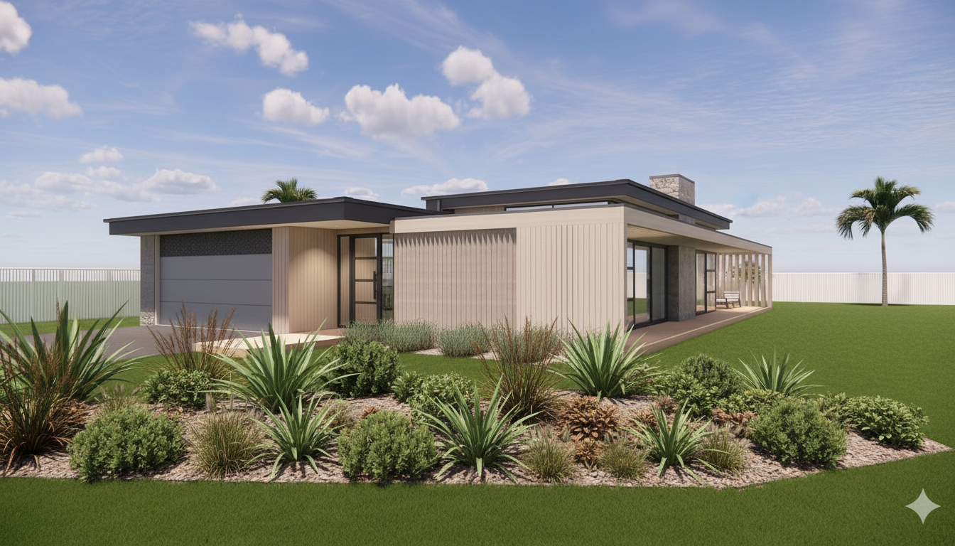 modernist exterior shot edit this image with precise architectural corrections only do not restyle or redesign the image critical preserve the building exactly as shown do not change colours materials lighting or overall style do not reinterpret or enhance finishes fix the following elements front entry clearly define the recessed front entry beside the garage ensure the front door is visible within the shaded alcove maintain the recessed depth door must sit behind the garage line do not move or flatten the entry garage fa ade introduce a clear horizontal break above the garage door add a distinct cladding section above the garage door ensure cladding does not run continuously from the door to the soffit keep materials and colours consistent with the original image fascia change the fascia board to a consistent dark colour matching the rest of the roof edges deck shorten the deck so it aligns with the house footprint avoid extending the deck too far beyond the fa ade constraints do not modify landscaping do not add or remove objects do not change lighting or sky do not adjust colour tones or contrast maintain the original render quality and appearance architecture